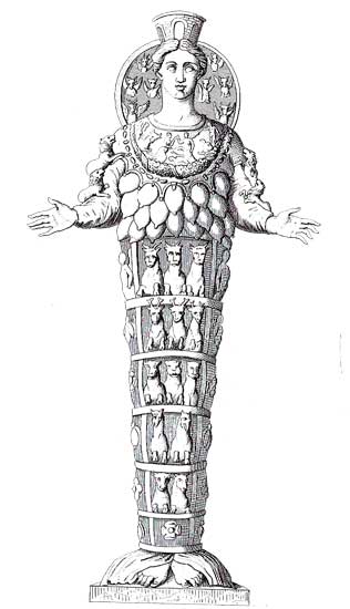 에페소스의 아르테미스 상은 근동 및 이집트 신들과 유사하며, 그리스 신들과는 다르다. 몸과 다리는 원뿔 모양의 기둥과 같은 조형물 안에 갇혀 있으며, 그 기둥에서 여신의 발이 튀어나와 있다. 에페소스에서 주조된 동전에서 여신은 도시의 벽과 같은 성벽관을 쓰고 있으며, 이는 도시의 보호자로서 키벨레의 속성이다.(''폴로스'' 참조).[46]