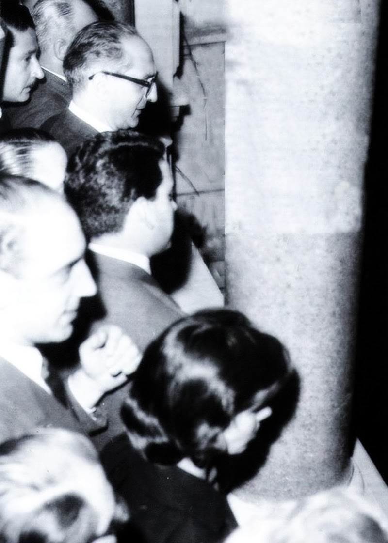 1984년 10월, 자신의 정당인 MID의 회의에서 프론디시가 고문 로헬리오 프리지리오와 함께 있다.