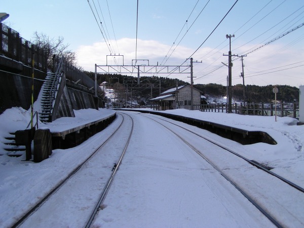 승강장은 국철 호쿠리쿠 본선 복선화 당시 해안을 따라 만들어졌다. 현재 역은 동해와 국도를 사이에 두고 조금 떨어져 있지만, 역 시설은 비교적 높은 위치에 있어 역 출구에서 동해를 바라볼 수 있다.