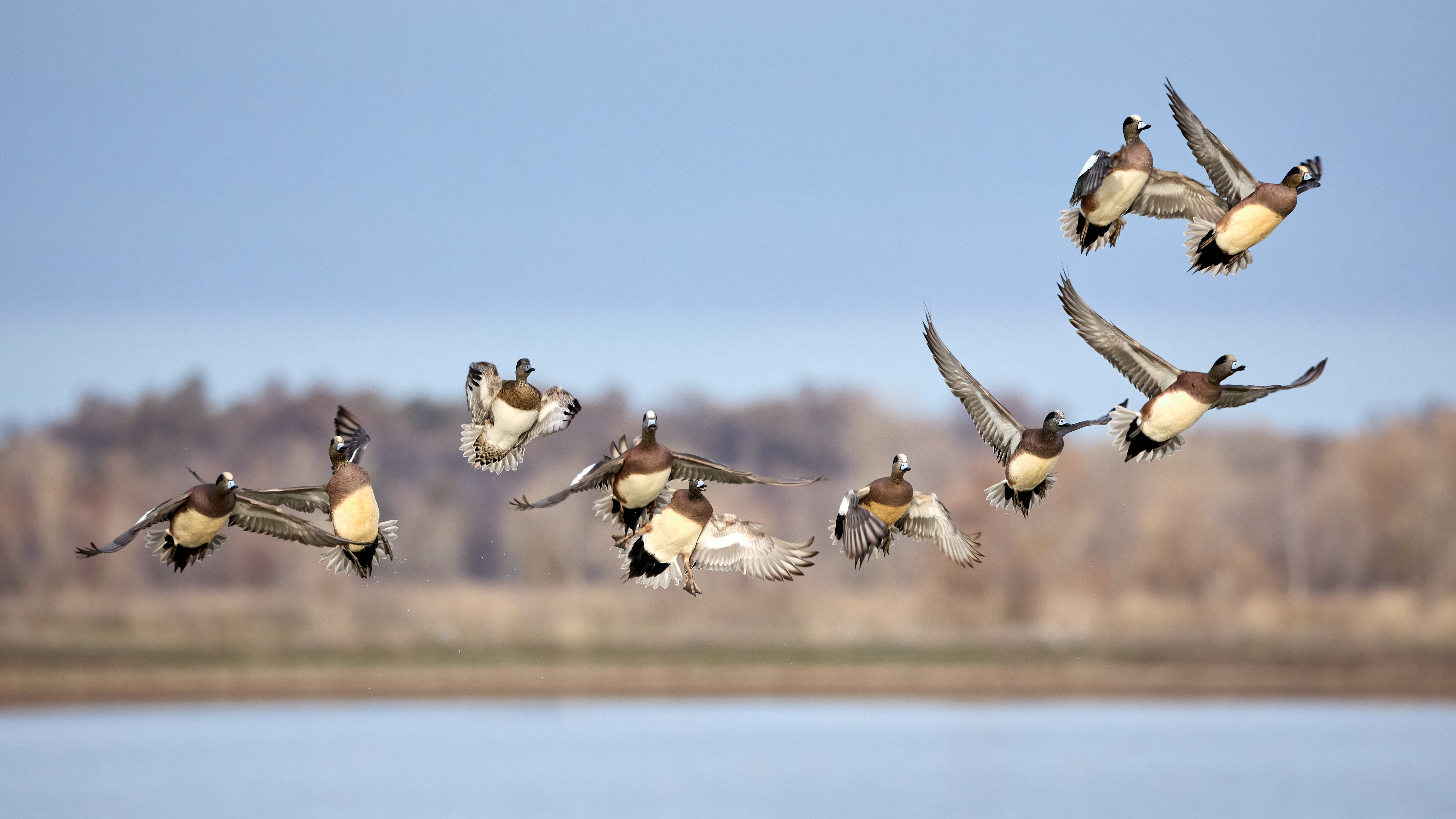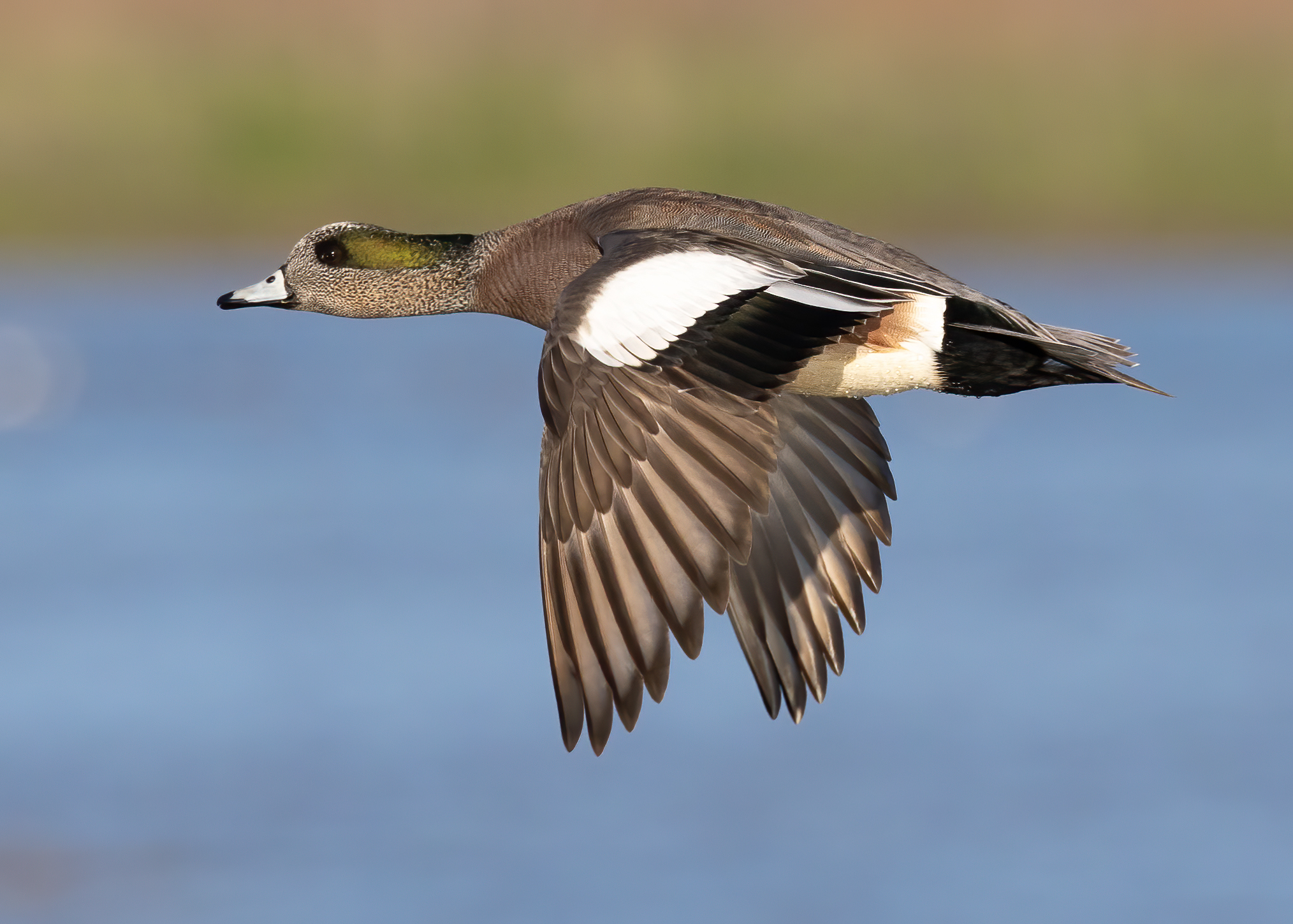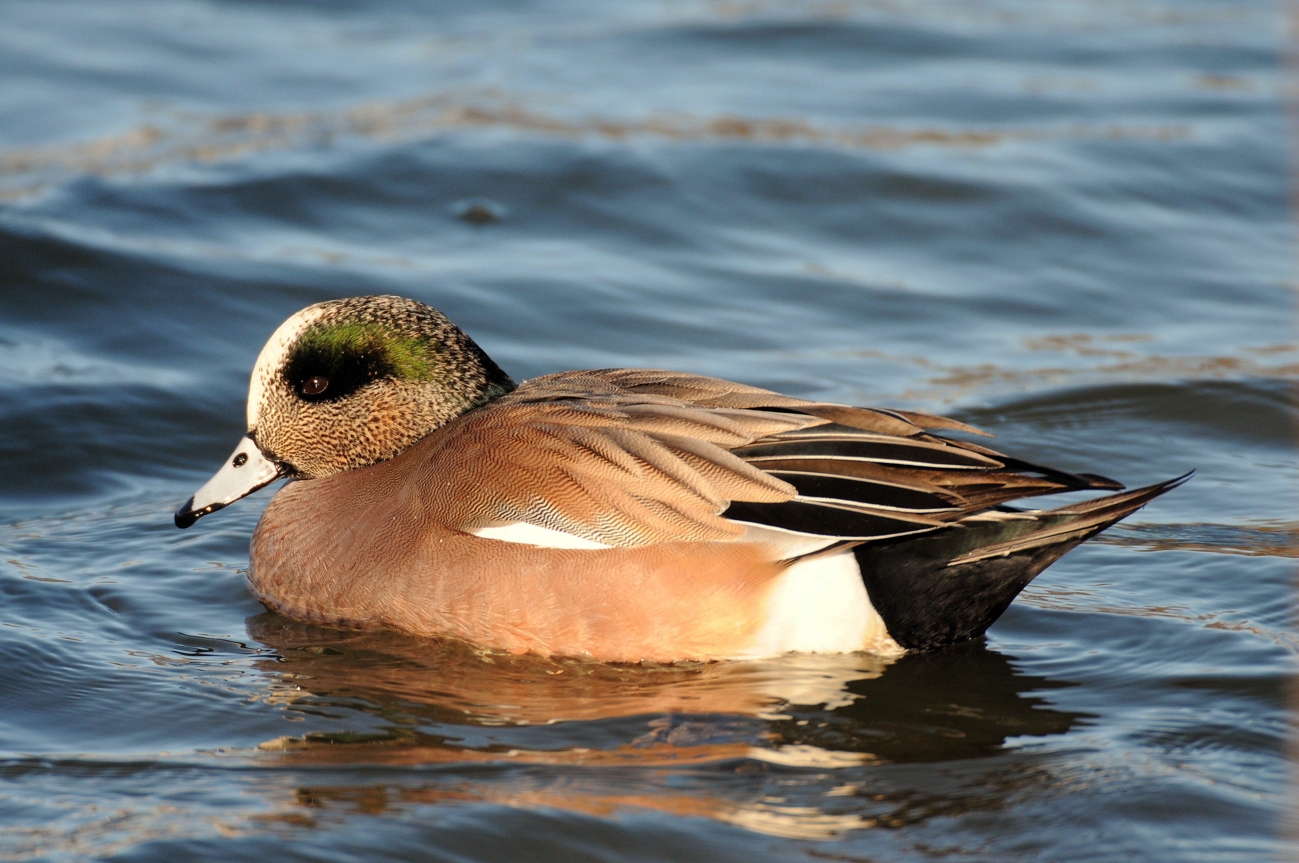 수컷 번식기에는 눈 주위에 녹색 깃털 가면과 머리 꼭대기에서 부리까지 이어지는 크림색 덮개가 있다.[13] 이 흰색 반점 때문에 "머리숱(baldpate)"이라는 이름이 붙었다.[13] 이마에서 뒷머리는 흰색이고 눈 주위에서 뒷머리까지 녹색이다. 얼굴 아래쪽은 흑갈색 반점들이 있다. 가슴과 옆구리는 갈색이다.[10] 수컷의 배는 흰색이다.[15] 비행 중에는 각 날개에 있는 큰 흰색 어깨 반점으로 수컷을 식별할 수 있다. 이 흰색 반점은 새가 방향을 바꾸고 돌 때 번쩍인다.[10]4. 3. 수컷 (비번식기)
