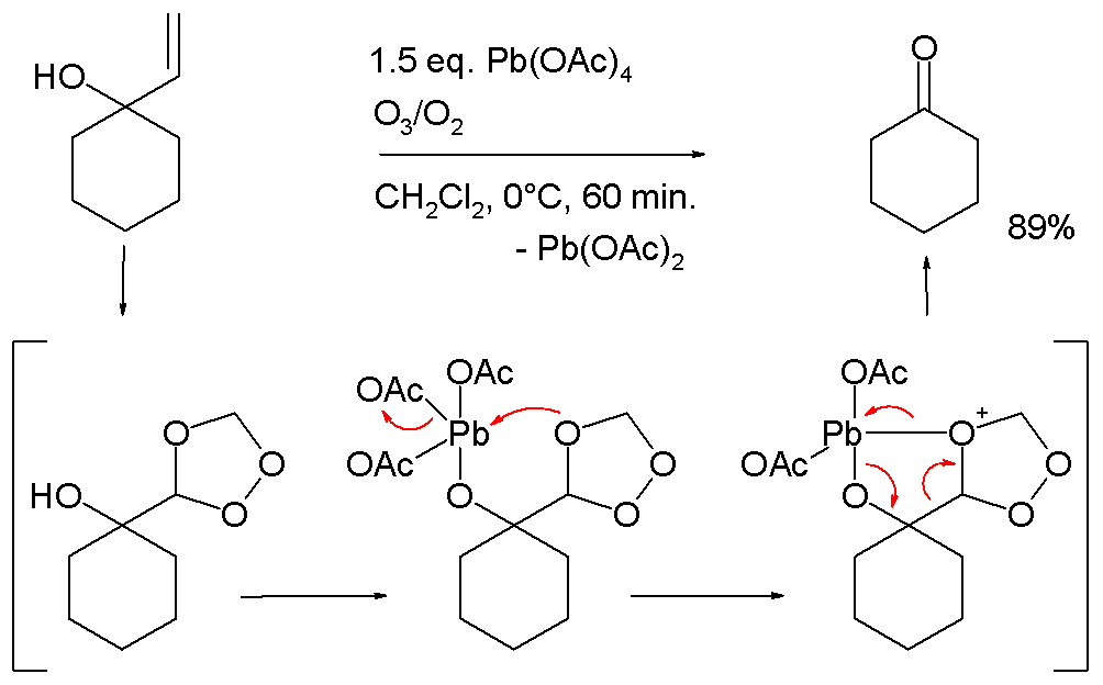 Conversion of 1-allylcyclohexanol to cyclohexanone, in the proposed reaction mechanism the allyl group is first converted to a trioxalane according to conventional ozonolysis which then interacts with the alkoxy lead group.