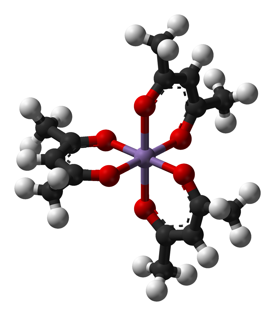 아세틸아세토네이트는 두 개의 산소 원자를 통해 많은 전이 금속 이온과 6원자 고리를 형성하며 결합한다. 예를 들어 Mn(acac)3,[20] VO(acac)2, Cu(acac)2, Fe(acac)3, Co(acac)3 등이 있다. 두 개 또는 세 개가 배위된 착물인 M(acac)2 및 M(acac)3 형태의 착물은 해당 할로겐 착물과는 대조적으로 일반적으로 유기 용매에 잘 녹는다. 따라서 아세틸아세톤 착물은 촉매 및 반응 시약의 전구체로 널리 사용된다. 그 외에도 NMR 시프트 시약, 유기 합성에서의 전이 금속 촉매, 산업적 히드로포르밀화 촉매의 전구체 등으로 사용된다. M(acac)3 형태의 착물은 모두 거울상 이성질체가 존재하며, 중심 금속의 산화수를 전기화학적으로 변화시켜 착물의 양을 조절할 수 있지만, 그 속도는 용매나 중심 금속에 따라 달라진다.[21]