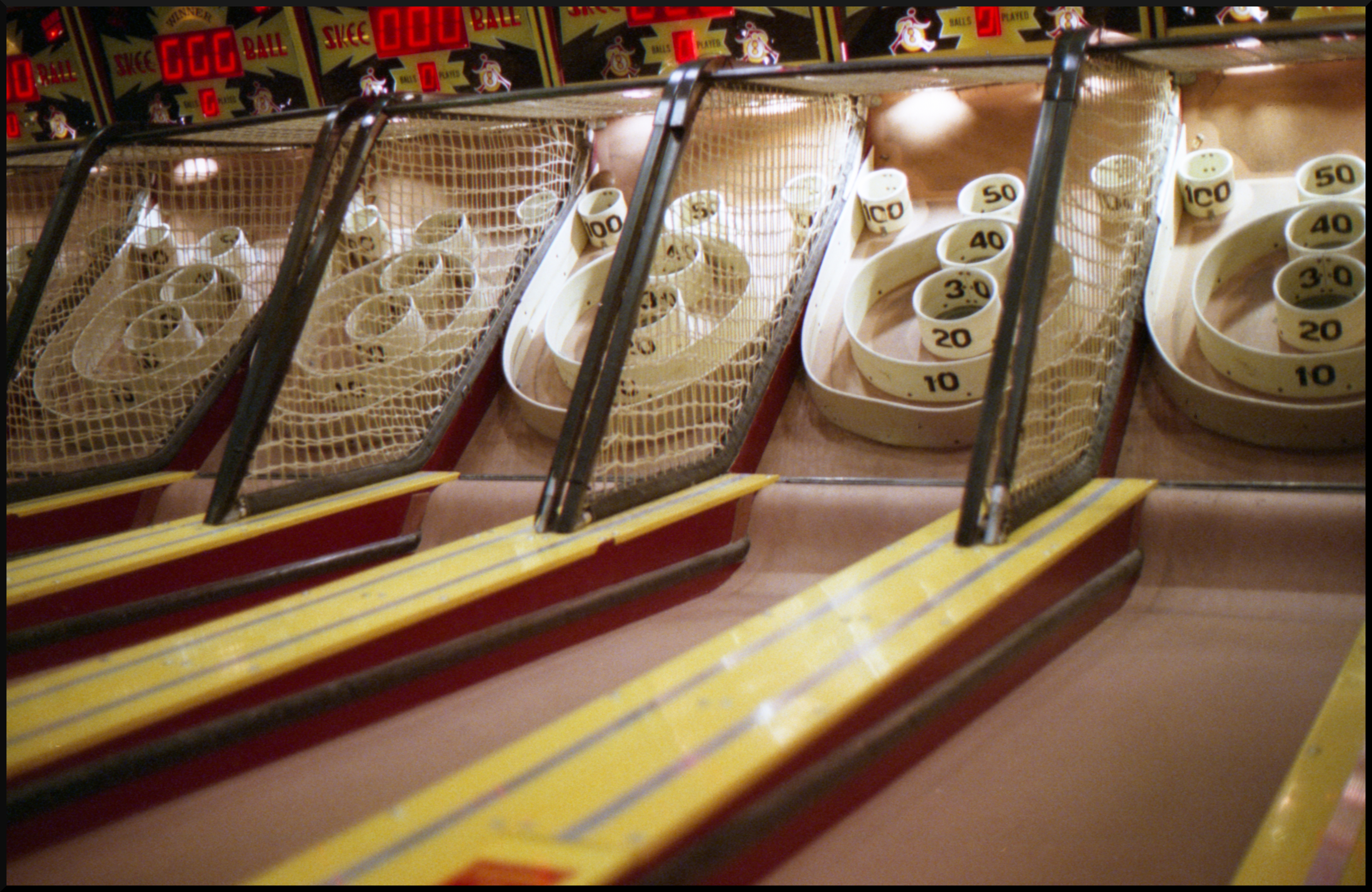 페니 아케이드에서 가장 인기 있는 오락 시설은 선정적이고 소프트 포르노를 특징으로 하는 뮤토스코프였고, 젊은 남성 관객을 끌어모으면서 부정적인 평판을 얻었다. 1910년대와 1920년대 영화 산업의 등장으로 관객들이 페니 아케이드에서 멀어지게 되었다.[12] 페니 아케이드에 고객을 다시 불러들이기 위해 새로운 인터랙티브 동전 투입식 기계가 제작되었고, 최초의 아케이드 게임이 탄생했다. 많은 게임이 더 큰 규모의 카니발 게임을 기반으로 했지만 자동화할 수 있는 수준으로 축소되었다. 인기 있는 스타일 중 하나는 19세기 바게텔 게임을 기반으로 한 핀 기반 게임이었다.[9] 이 핀 기반 게임 중 하나는 플레이어가 플런저 하나로 표적을 쓰러뜨리기 위해 제한된 수의 공을 사용해야 하는 핀볼 게임의 전신인 ''배플 볼''이었다.[12] 스키 볼은 애틀랜틱 시티 보드워크 아케이드에서 선보인 후 인기를 얻었다. 이러한 게임의 인기는 1930년대 대공황의 영향으로 저렴한 오락을 제공하면서 더욱 커졌다.[12]