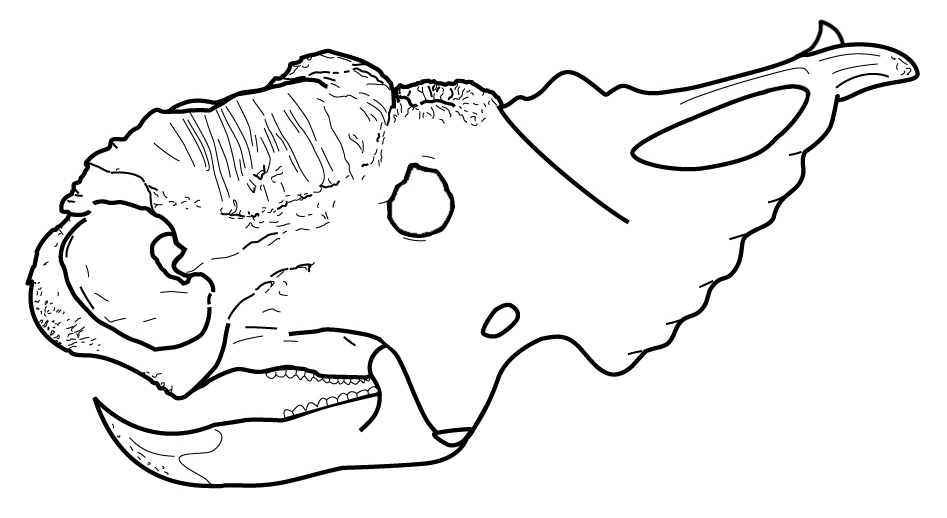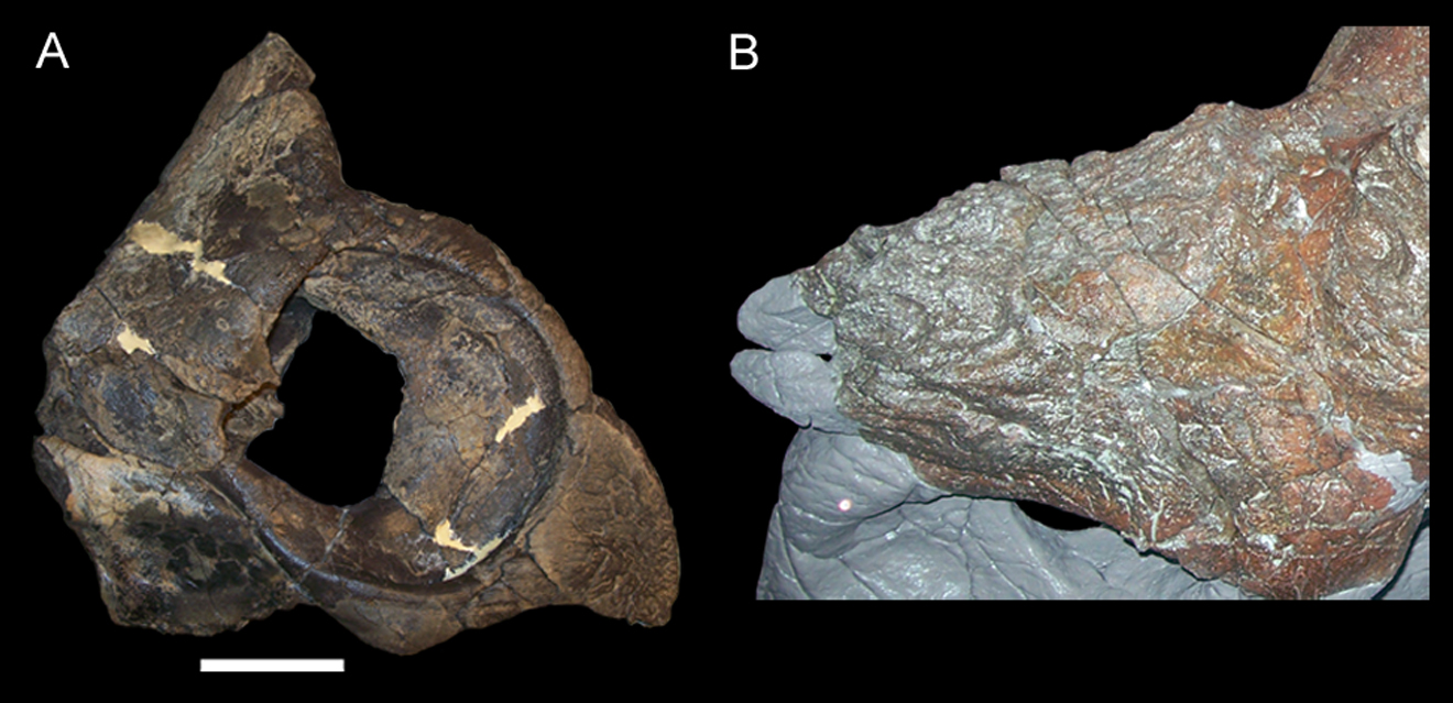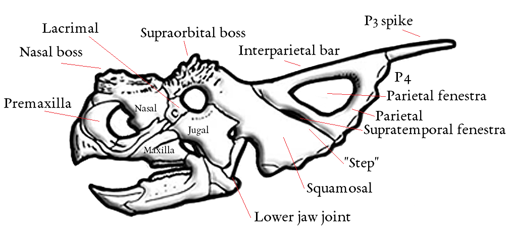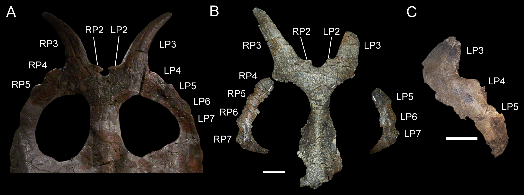 성체 두개골은 또한 눈 위의 상안와 부위에 크고 주름지고 타원형의 돌기를 가지고 있었다. 상안와 돌기는 안와후골에서 앞으로 뻗어 삼각형의 안검골과 전두골을 포함하며, 중간에 두꺼운 가로 능선이 있었는데, 기저부가 두껍고 위쪽으로 갈수록 얇아졌다.[7] 융합된 전두골은 비강 돌기에 도달하지 못하여,[7] 비강 돌기와 상안와 돌기를 분리하는 독특한 가로 안장 모양의 홈을 형성했다.[7] 이 돌기는 파키리노사우루스의 돌기와 유사했지만, 더 높은 능선과 더 두드러진 주름을 가지고 있었다.[7]