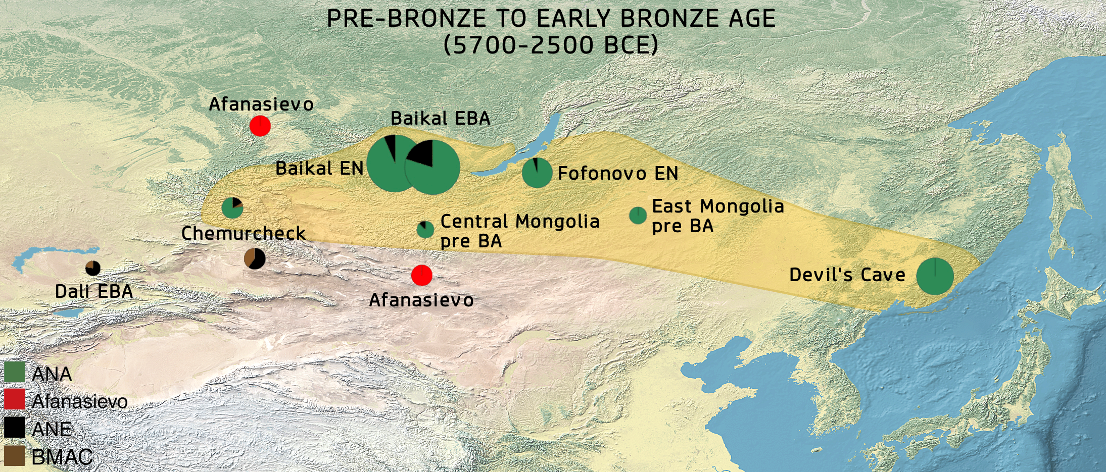 고대 동북아시아인(ANA, 노란색 영역)은 알타이 산맥에서 태평양 연안의 악마의 문 동굴까지의 신석기 시대 집단으로 정의된다.