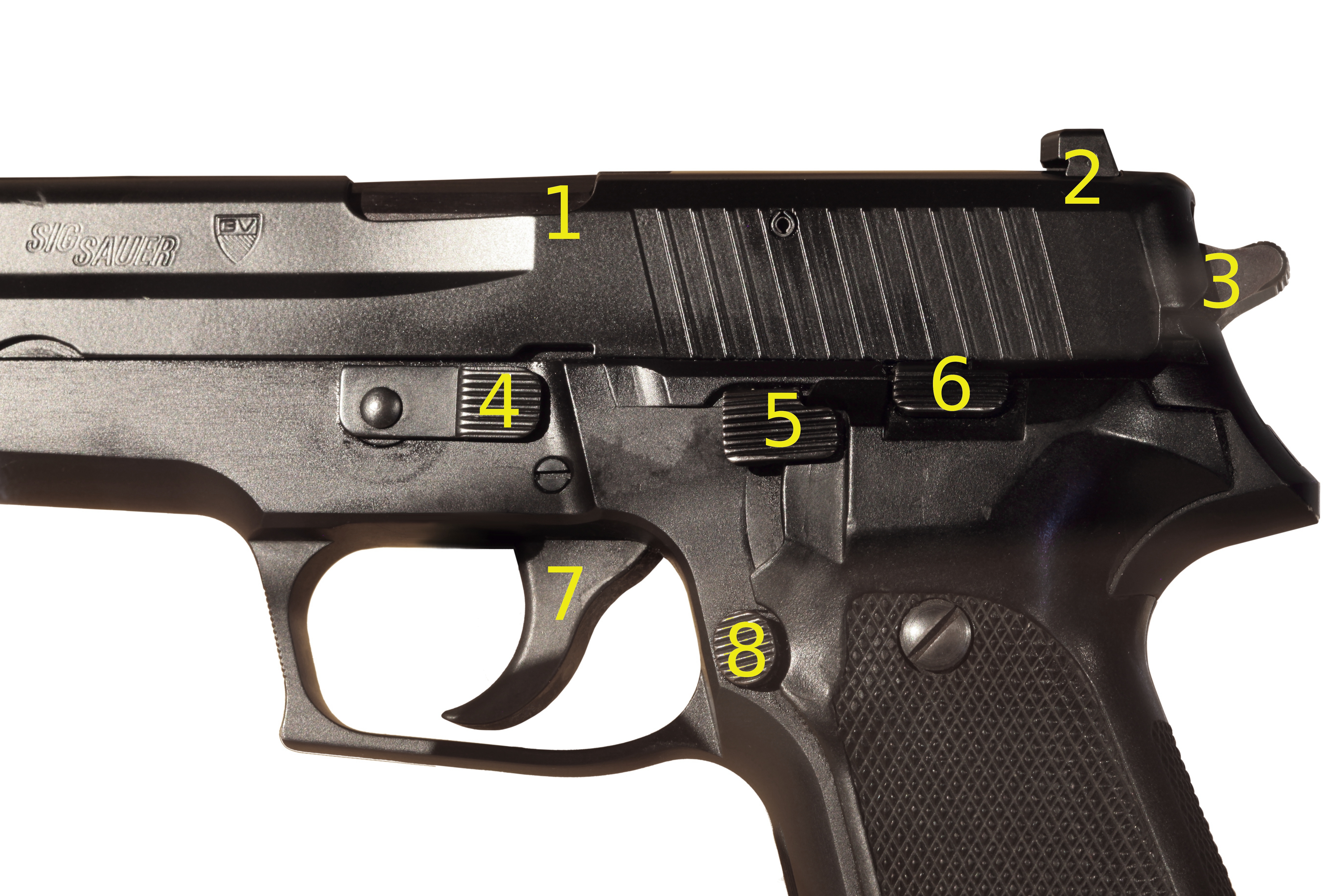 SIG 사우어 P226의 컨트롤 및 부품: 1. 탄피 배출구 2. 후방 가늠자 3. 해머, 4. 분해 레버 5. '''디코커''' 6. 슬라이드 스톱 7. 방아쇠 8. 탄창 멈치