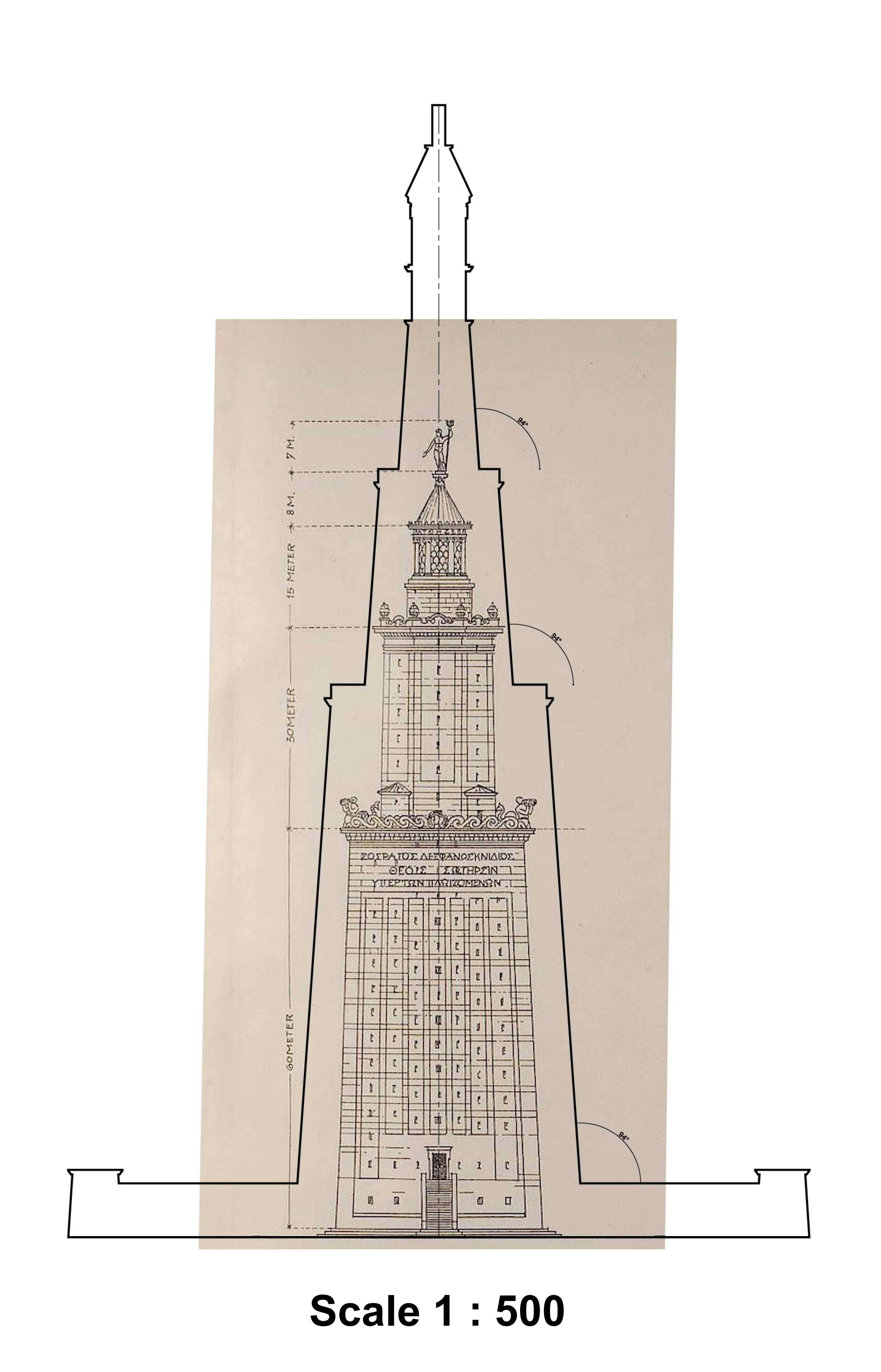 기원전 332년, 알렉산드로스 3세가 나일강 하구에 알렉산드리아를 건설했다.[6] 알렉산드로스 사후 이집트는 프톨레마이오스 1세의 통치하에 놓였고, 프톨레마이오스 왕조가 알렉산드리아를 수도로 삼았다. 알렉산드리아는 파로스 섬과 연결되어 국제 무역항으로 발전했지만, 주변이 평탄한 지형이라 연안 항해나 입항 시 육지를 식별하기 어려웠다. 따라서 프톨레마이오스 1세는 선박의 안전한 항해를 위한 육표로 등대 건설을 결정했다. 건설은 크니도스의 소스트라토스가 지휘하였으며, 건설 장소는 알렉산드리아 만의 파로스 섬이 선택되었다. 파로스 섬과 알렉산드리아 항구는 인공적인 통로로 연결되었다.2. 2. 건설 과정
