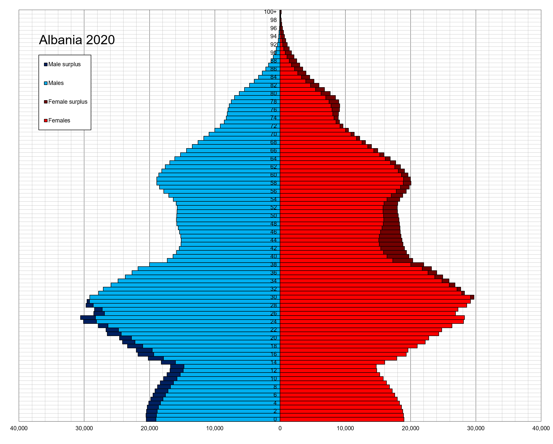 2020년 추산 알바니아의 인구 구조는 다음과 같다.[41]