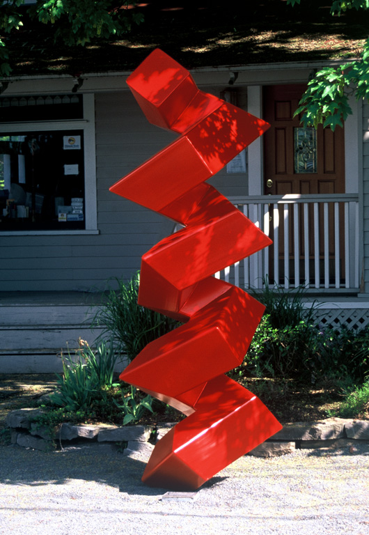 줄리안 포스-안드레아의 "리너스 폴링을 위한 알파 나선"(2004), 분체 도장 강철, 높이 . 이 조각품은 미국 오리건 주 포틀랜드의 3945 SE 호손 대로에 있는 라이너스 폴링의 어린 시절 집 앞에 세워져 있다.