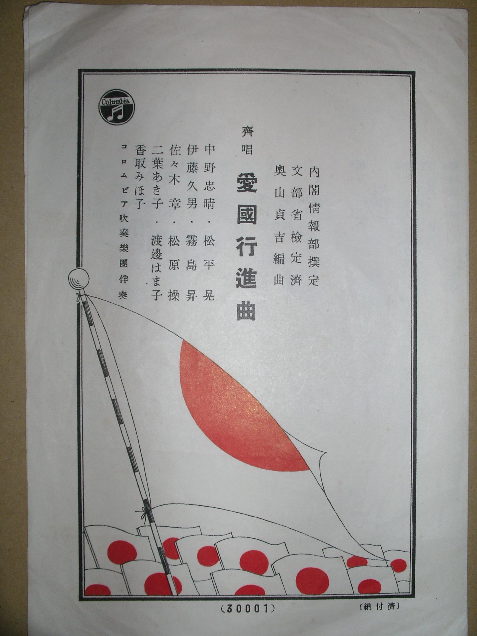 愛国行進曲일본어1937년 일본 제국이 '국민이 영원히 애창해야 할 국민가'로 제정한 노래이다. 세토구치 도키치가 작곡했으며, 가사는 공모를 통해 선정되었다.[5] 이 노래는 일본 제국의 침략 전쟁을 정당화하고 미화하며, 군국주의 이념을 선전하는 도구로 활용되었다는 비판을 받고 있다.