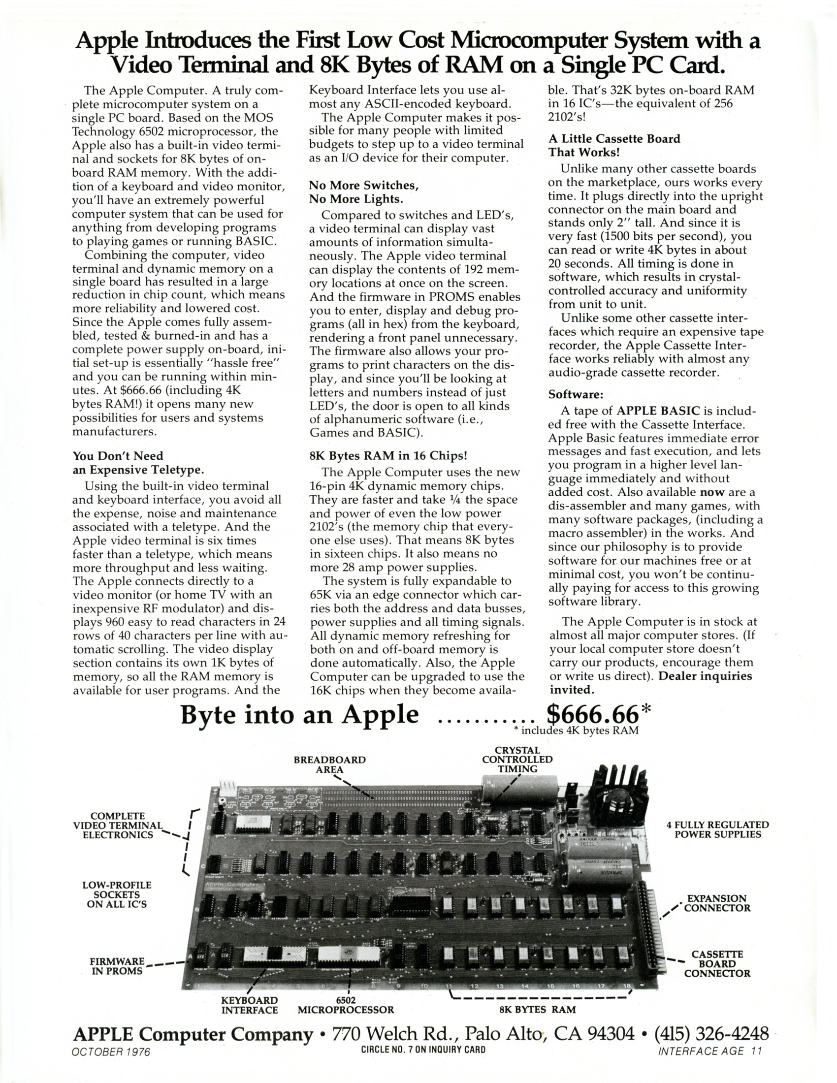 1976년 7월, Apple I은 캘리포니아주 파로알토의 홈브루 컴퓨터 클럽에서 공개되었다.[79]