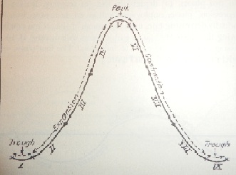 앨빈 한센은 경기 순환을 고용, 생산, 물가의 변동으로 정의하고, 저점에서 고점까지의 확장기와 고점에서 저점까지의 수축기로 구분했다. 그는 안정적인 경기 순환과 불안정적인 경기 순환이 존재하며, 불안정성은 외부 충격으로 인한 변위에 의해 발생한다고 주장했다. 또한 경기 순환 분석은 기술 진보, 통화 시장, 기대를 고려해야 한다고 주장했다.[7]
