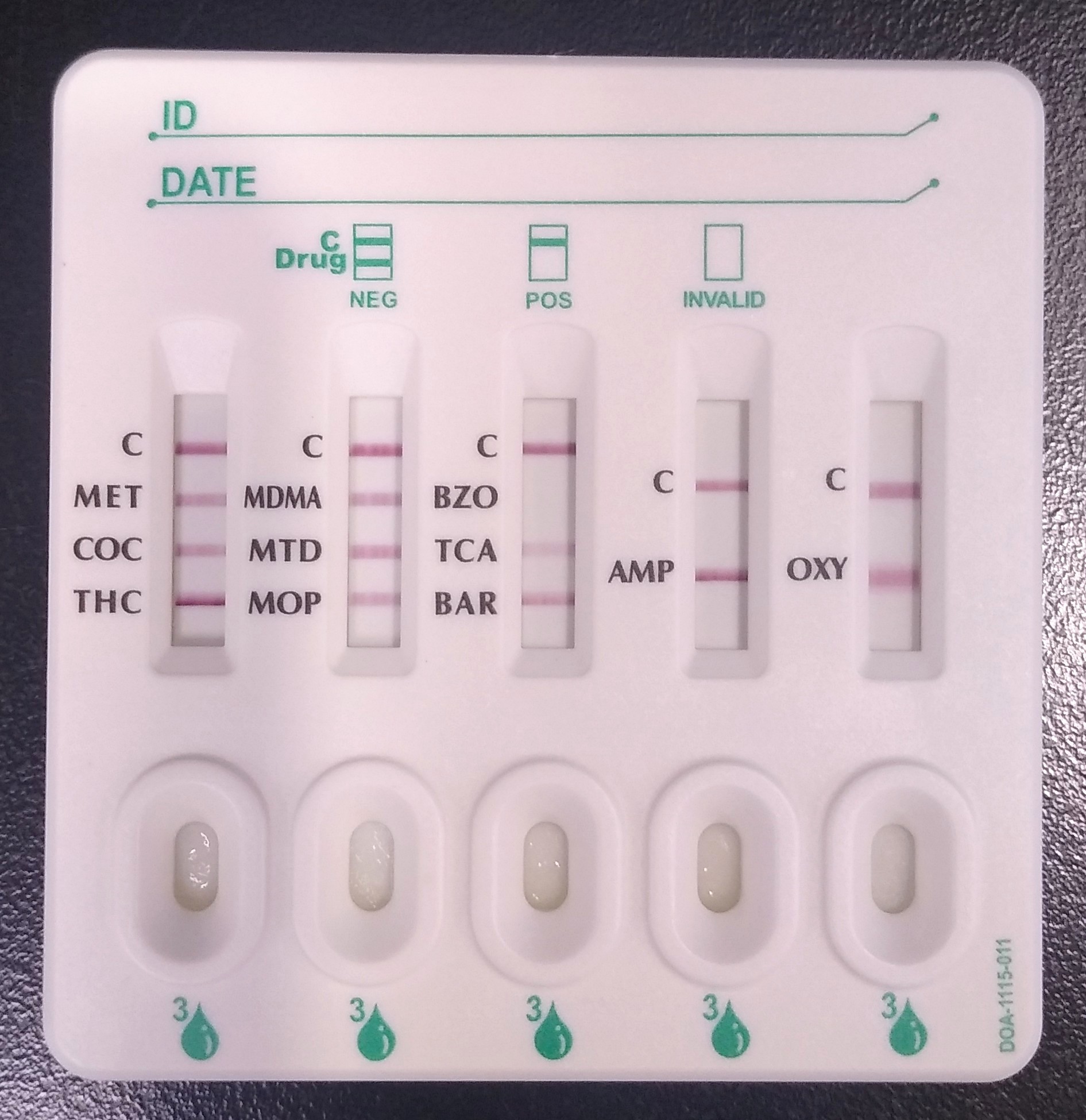소변 약물 검사는 경쟁 결합의 원리를 이용한 면역 분석법이다. 소변 검체에 약물이 존재하면 특정 항체에 대한 결합 부위를 두고 약물 접합체와 경쟁한다. 검사 과정에서 소변 검체는 모세관 작용으로 위로 이동한다. 만약 소변에 특정 약물이 컷오프 농도 미만으로 존재하면, 항체의 결합 부위는 포화되지 않는다. 그러면 항체는 약물-단백질 접합체와 반응하여 특정 약물 스트립의 검사선 영역에 가시적인 색상 선을 나타낸다.[20]