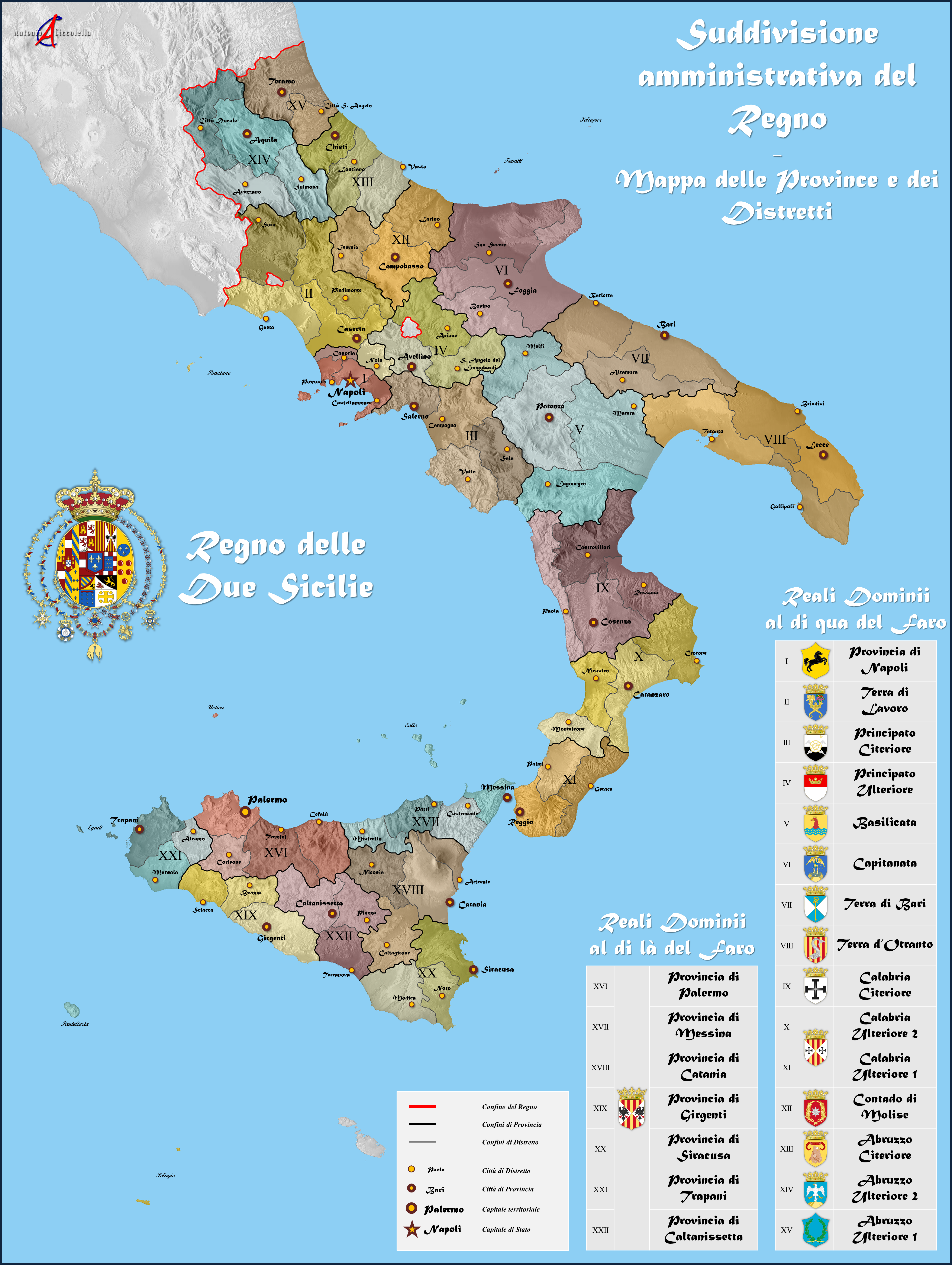 양시칠리아 왕국은 크게 반도와 시칠리아로 나뉘어 있었으며, 반도는 15개의 데파르트망[55][56], 시칠리아는 7개의 데파르트망[57]으로 구성되었다. 1860년, 양시칠리아가 사르데냐 왕국에 정복되면서 데파르트망은 우르바노 라타치 법에 따라 이탈리아의 행정 구역이 되었다.[58]