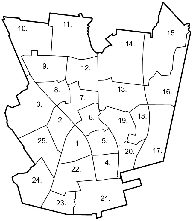 얘르벤패는 25개의 구역으로 나뉜다. 개별 구역의 위치는 첨부된 지도에 표시되어 있다.