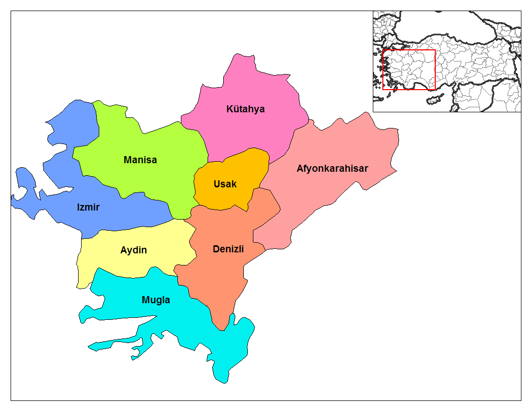 주 | 아피온카라히사르 주 아이든 주 데니즐리 주 이즈미르 주 퀴타히아 주 마니사 주 무을라 주 우샤크 주 |