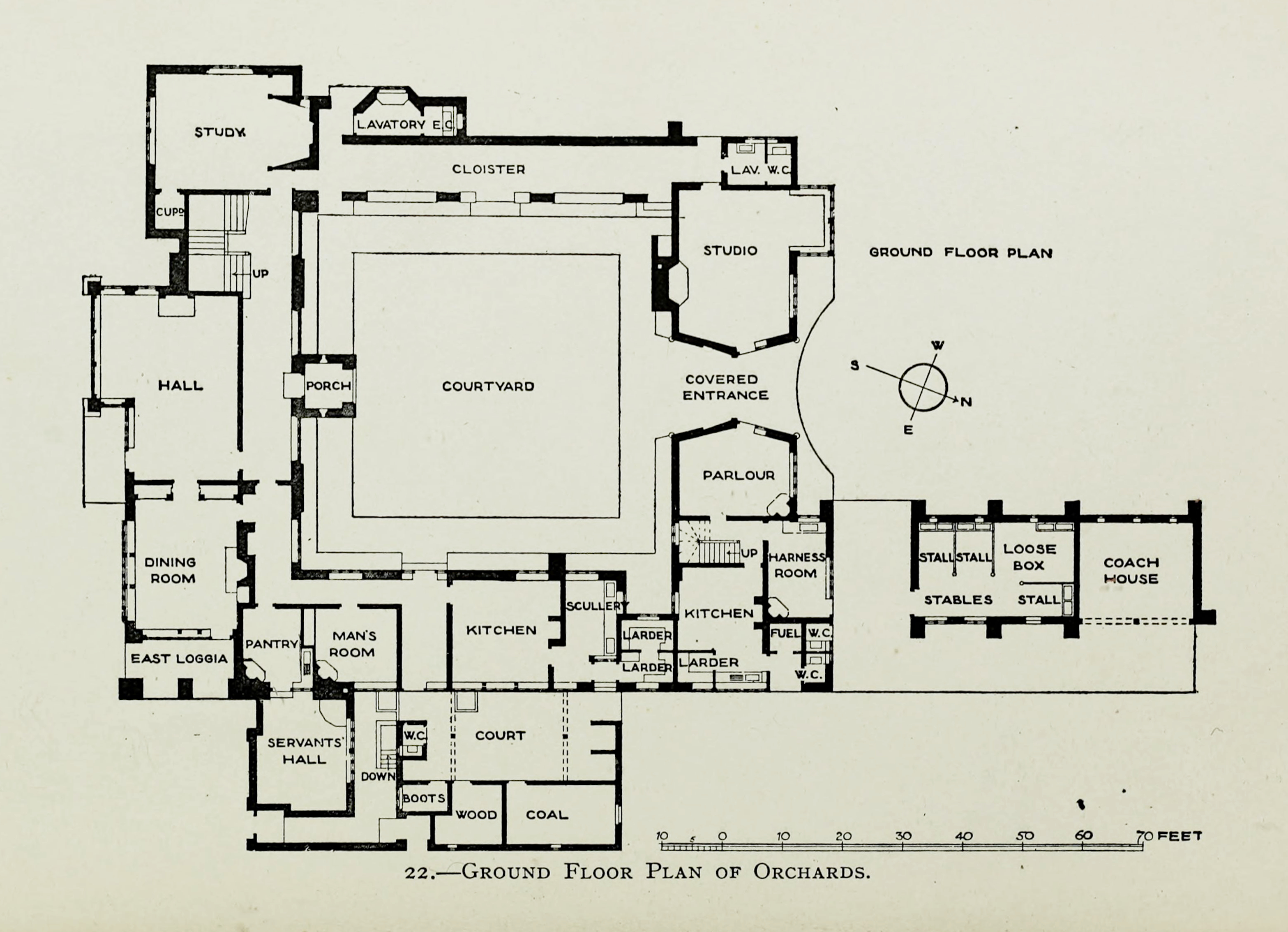 루티언스의 초기 작품은 대부분 예술 및 공예 양식의 개인 주택으로, 튜더 건축과 잉글랜드 남동부 토착 양식의 영향을 강하게 받았다. 이 시기는 그의 경력에서 가장 혁신적인 단계였다. 주요 작품으로는 먼스테드 우드[10], 티그본 코트, 오처드, 서리의 고다드, 데이너리 가든, 버크셔의 설럼스테드 폴리 팜, 노퍽의 오버스트랜드 홀, 프랑스의 르 부아 데 무티에 등이 있다.