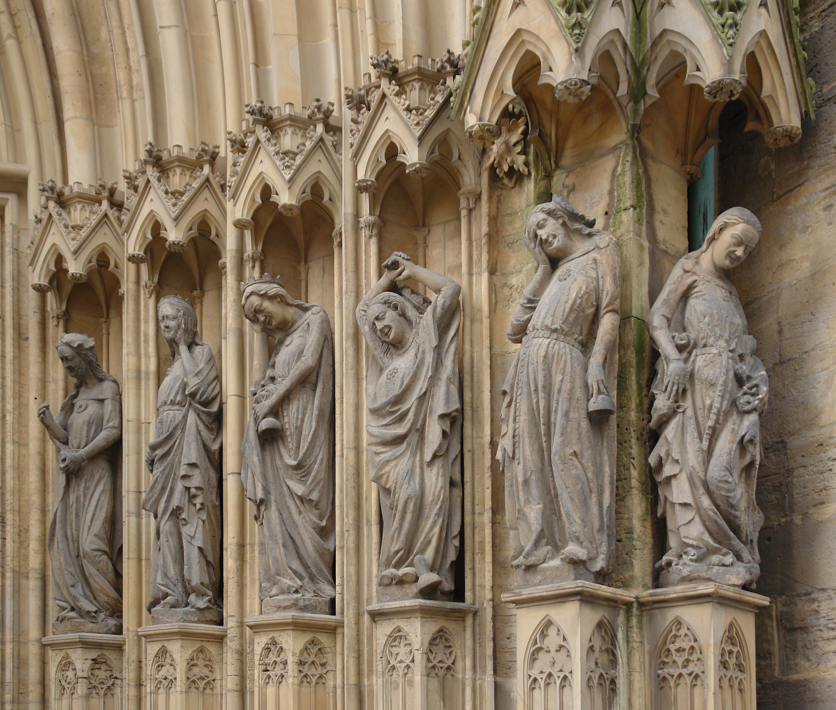 - 현명한 처녀와 어리석은 처녀 조각상: 출입구 밖에 위치해 있다.[5]