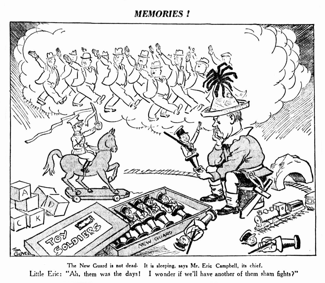 뉴 가드는 대영 제국에 대한 충성, 건전한 대표 정부에 대한 지지, 불충실하고 부도덕한 요소의 억제를 기본 원칙으로 내세웠다.[51] 이러한 원칙에 동의하는 사람들을 위해, 뉴 가드의 목표는 "신조, 정당, 사회적 또는 재정적 지위와 관계없이 모든 충성스러운 시민"을 뉴 가드의 "정식으로 임명된 일반 평의회"에 "충성스러운 지원"을 약속하는 하나의 협회로 통합하는 것이었다.[51] 1931년 7월 22일 시드니 시청에서 열린 "뉴 가드의 충성파 재결합" 회의에는 4,000명의 열광적인 청중이 참석했다. 캠벨은 연설에서 조직이 "심각하게 결심하고 완전히 준비되었으며, 신의 은총으로, 공산주의 조직 세력의 공개 반란이나 혁명적 법령을 통해 시도될지라도, 이 국가가 소비에트화되는 것을 막을 수 있다"고 선언했다.[55] 캠벨의 집회 연설은 라디오 방송국 2GB를 통해 생중계되었다.[56]존 프리스(John Frith)의 에릭 캠벨 캐리커처.
