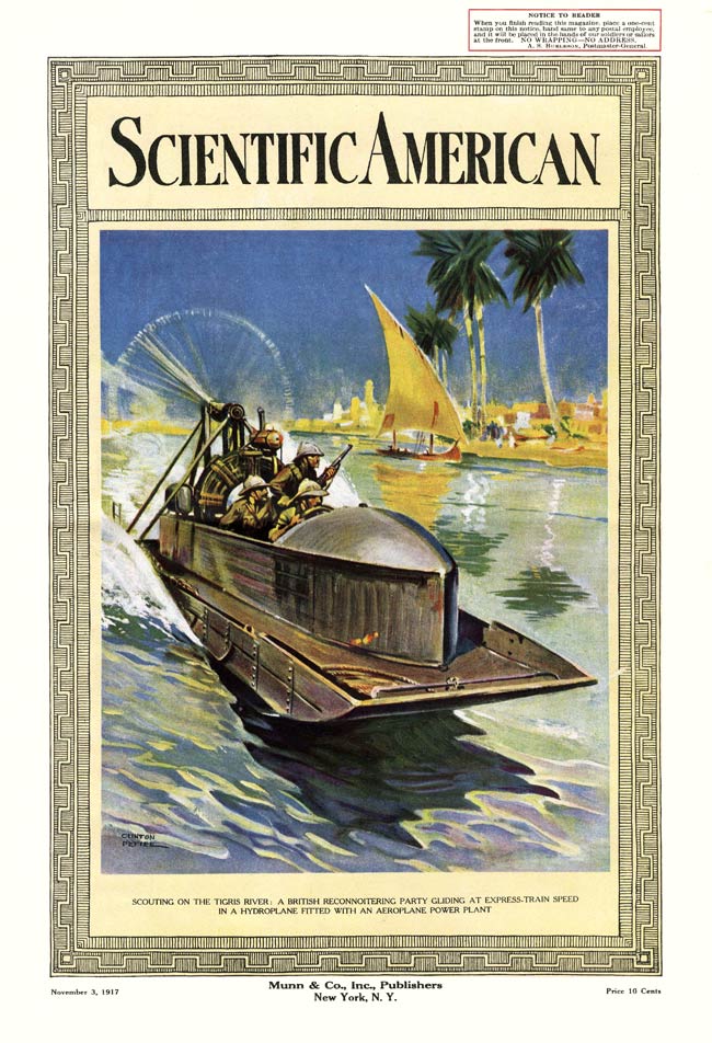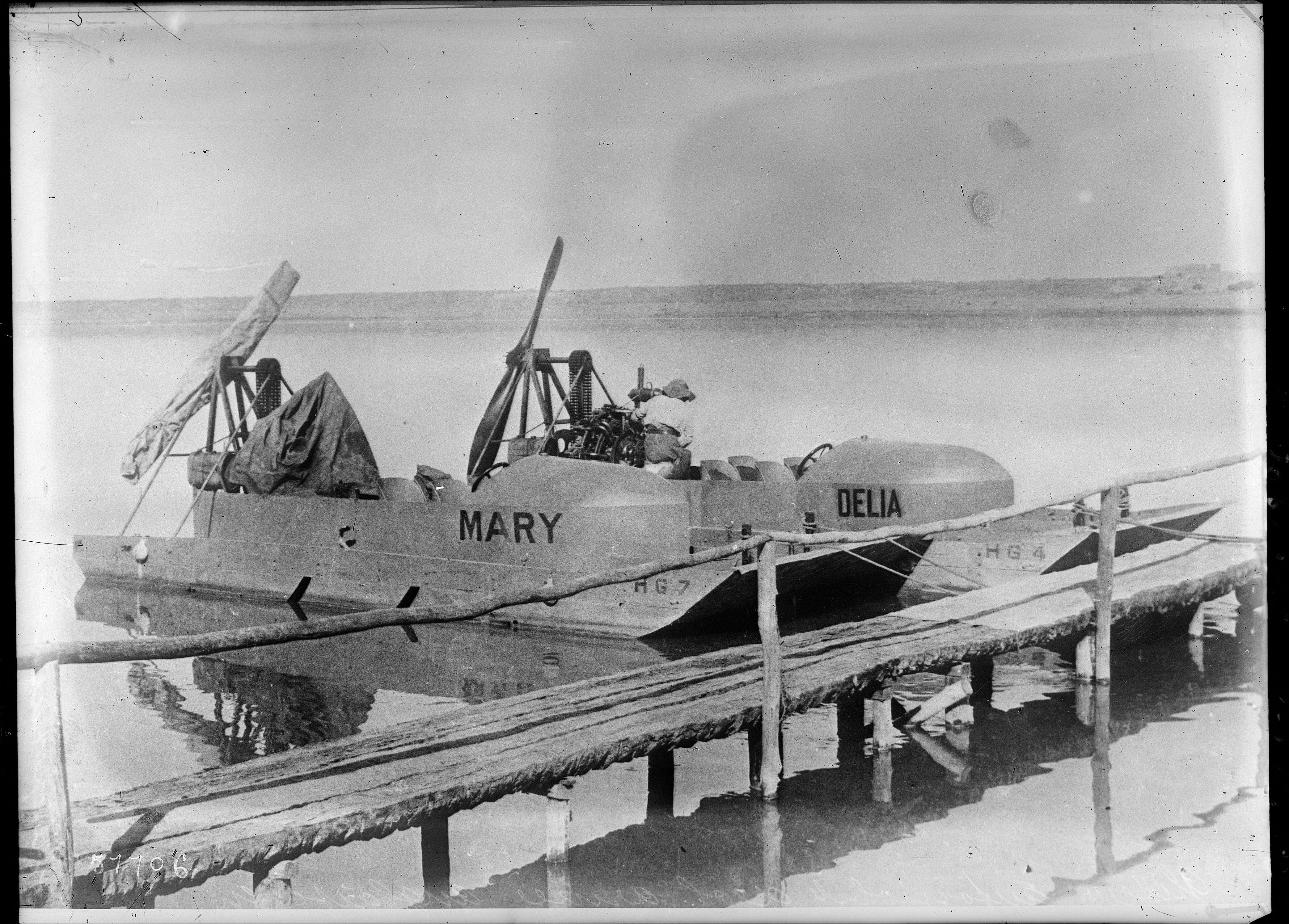 최초로 사용된 에어보트는 1915년 영국군의 랑베르 "하이드로-글리세르"이다. 이 에어보트는 크고 평평한 바닥의 수상비행기로, 금속으로 피복된 나무 선체에 큰 항공기 프로펠러가 장착되어 최대 55mph의 속도에 도달할 수 있었다.[14] 주로 티그리스 강 정찰에 사용되었다.[11] 최초의 에어보트인 HG 1 ''아리엘''은 파손된 오스트레일리아 왕립 공군 파르망 MF.7 쌍발기의 엔진과 프로펠러를 사용하여 제작되었으며, 영국 인도에 의해 메소포타미아 주둔군에 제공되었다.[12] 1915~1916년 ''아리엘''의 쿠트까지의 상류 전역 성공적인 배치 이후, 영국은 샤를 드 랑베르의 동명 회사인 ''드 랑베르''로부터 특수 제작된 에어보트 7척을 주문했다. 1917년에 8척, 1918년 휴전까지 9척이 운영되었다.[13] 바그다드의 자동차 수리 도크야드에 전용 수리 슬립웨이가 건설된 것은 영국의 전쟁 노력에 대한 중요성과 유지보수의 어려움을 보여준다.