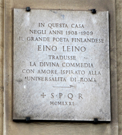 레이노가 단테의 《신곡》을 번역했을 때 살았던 건물의 벽, 테베레 강 근처 로마에 있는 기념 명판