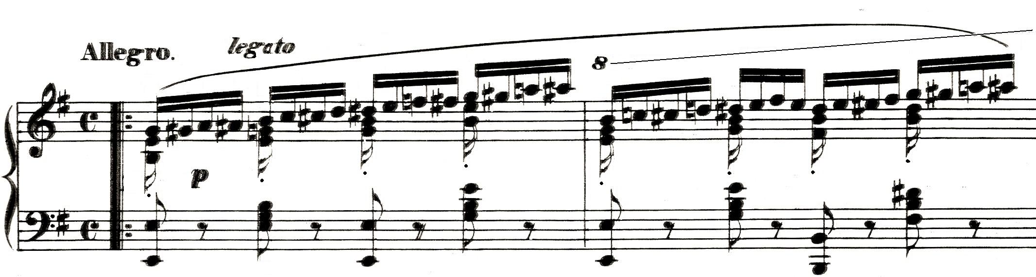 쇼팽은 반음계 음계를 셈프레 레가토 (항상 부드럽게 이어서)로 연주할 것을 요구했는데, 이는 스타카토로 연주되는 반주 화음과 뚜렷한 대조를 이룬다.