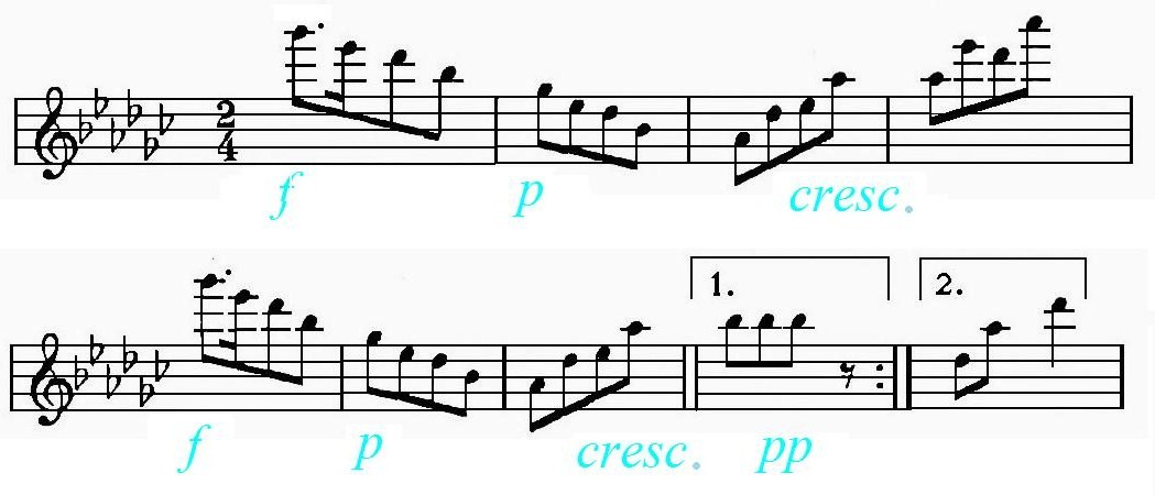 멜로디 축약(스코틀랜드의 지그 스타일) (A 부분) Leichtentritt에 따름