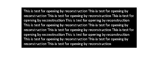 위의 이미지는 입력 텍스트 이미지에서 수직 스트로크를 추출하는 간단한 재구성 열기 예제를 보여준다. 원본 이미지가 회색조에서 이진 이미지로 변환되었으므로 일부 문자에 약간의 왜곡이 있어 동일한 문자가 다른 수직 길이를 가질 수 있다. 이 경우 구조 요소는 관심 객체를 찾기 위해 침식 연산에 적용되는 8픽셀 수직선이다. 또한 팽창에 의한 형태학적 재구성 [1][2]는 결과 이미지가 수렴될 때까지 번 반복한다.