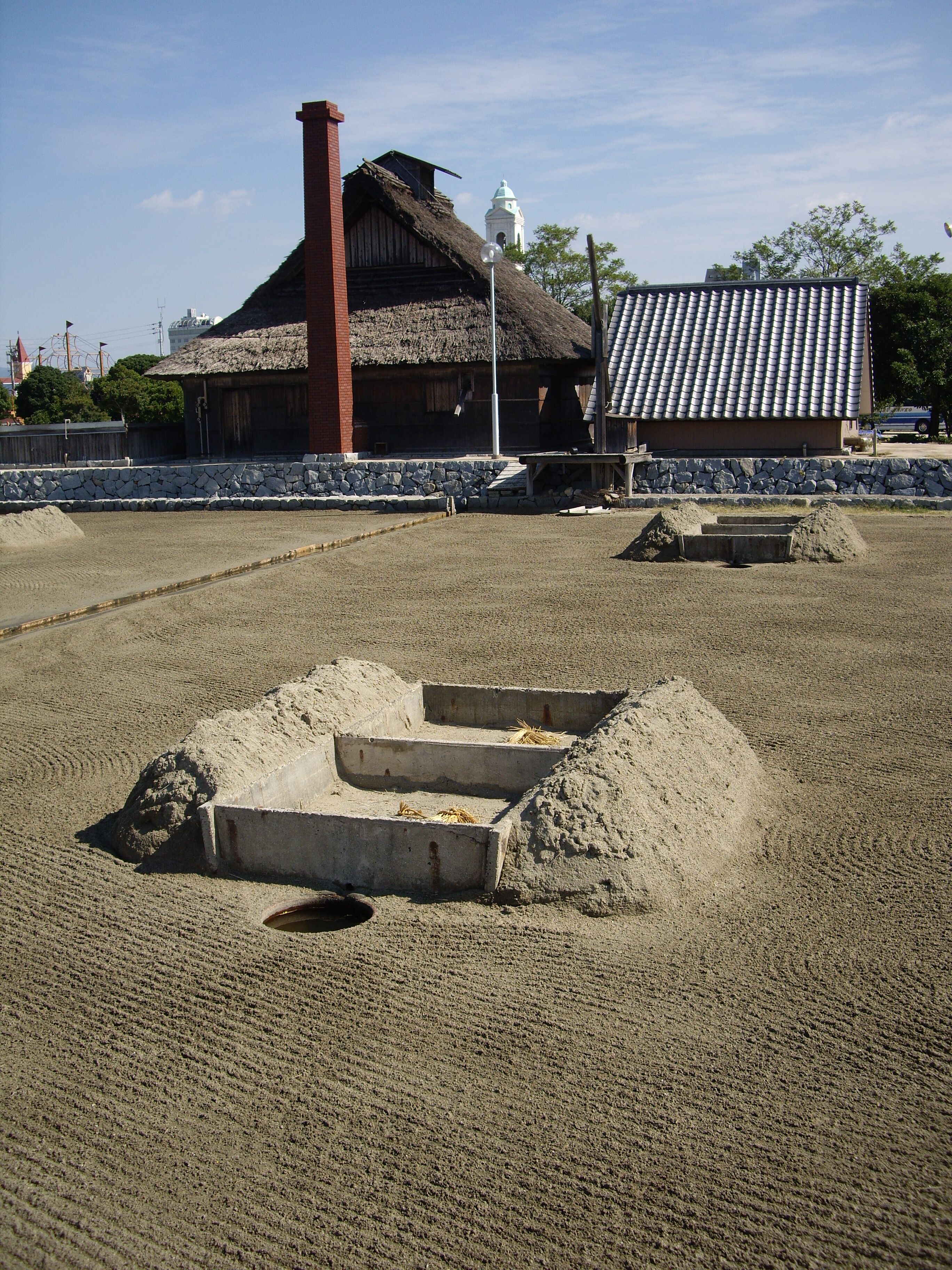 “조염소성(藻塩焼)” 시대를 거쳐 소금의 수요가 증가함에 따라 해수 중의 염분이 부착된 해안의 모래를 채염 작업에 이용하는 제염법이 발달했다. “도함(塗浜)”이라 불리는, 둑을 쌓은 위에 해수가 지중에 스며들지 않도록 두께 10cm 정도의 점토(粘土)[15] 등으로 단단한 방수층을 형성하고, 그 위에 입자가 고운 모래(염사)를 깔아 놓는다. 염사 위에 해수를 정성스럽게 뿌리고, 자주 저어주면서 햇볕과 바람으로 충분히 수분을 증발시킨 후, 염사를 모아 해수로 씻어 염수를 만들고, 그것을 제염가마에서 고아 결정을 얻는다. 1염호(塩戸) 분의 염전 면적은 평균하여 1반보(약 990㎡) 전후가 일반적이었다.
