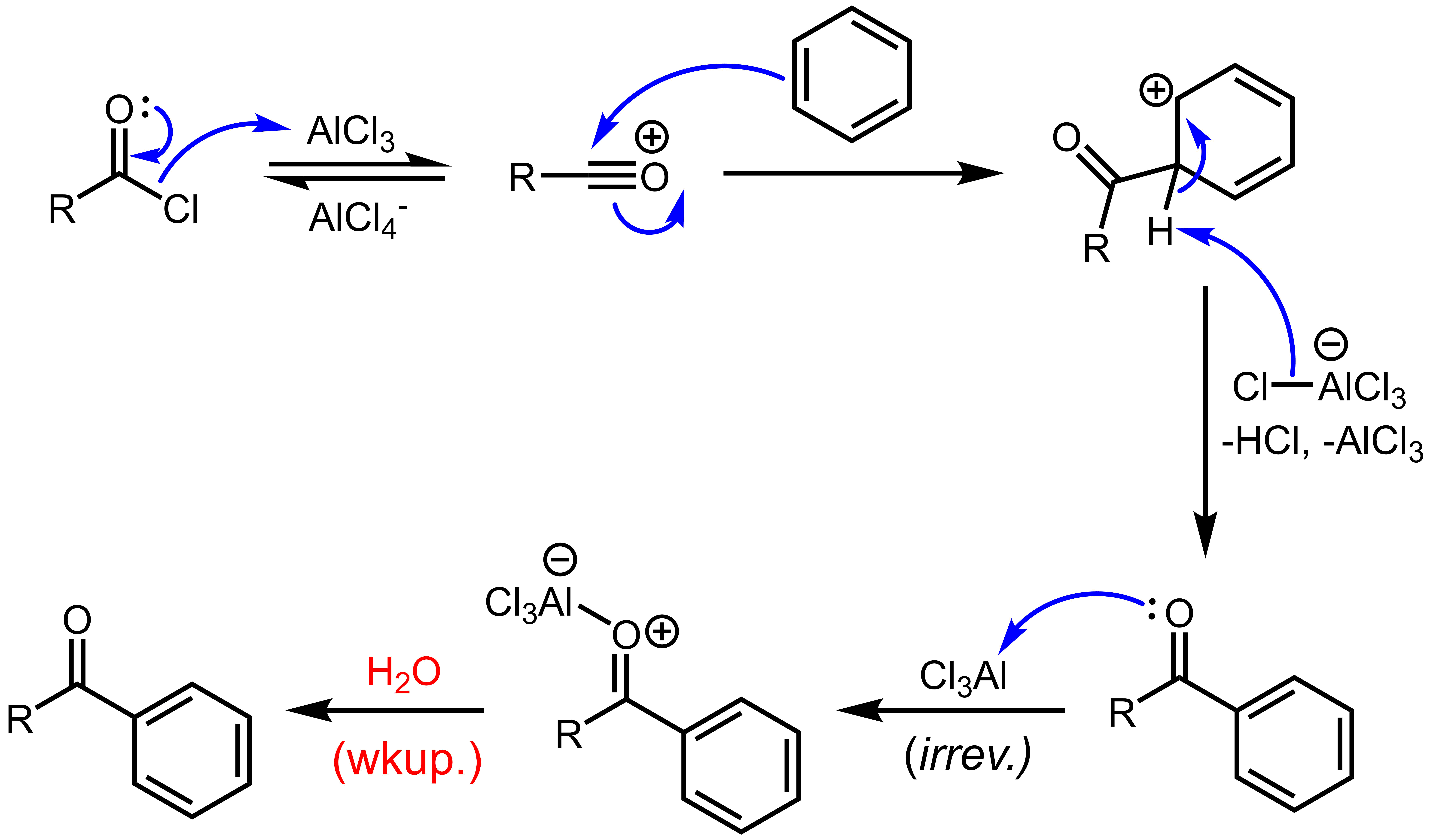 일반적으로 방향족 염화 아실은 지방족 염화 아실보다 반응성이 낮아 더 강한 반응 조건이 필요하다.
