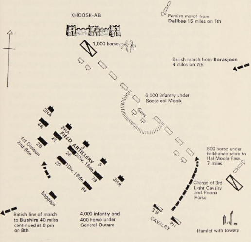 영국 침공군은 두 개의 사단으로 나뉘었다.[19] 봄베이 육군의 제임스 아웃럼 경이 이란에서 영국 작전을 지휘하게 되었다.[19] 부셰르에 상륙을 감행한 제1사단은 스토커 소장과 윌슨 준장이 지휘했다. 제2사단은 하벨록 준장과 아웃럼 경 소장(K.C.B.)이 지휘했는데, 아웃럼 경은 최고 지휘권을 인수하고 페르시아에서 영국 작전을 지휘하라는 지시를 받고 인도로 영국에서 도착했다.[19] 봄베이 정부는 아웃럼에게 제14킹스 경기병, 제78하이랜더스, 제23 네이티브 경기병, 제26 네이티브 보병, 제이콥의 신드 기병, 기마 포병 1개 소대, 야전 포대 2개, 여러 네이티브 보병 연대에서 차출된 10개 중대로 구성된 경보병 대대를 배속했다.[19] 아웃럼은 페르시아에서 이 제2사단을 지휘하는 동안 중장 임시 계급을 받았다.