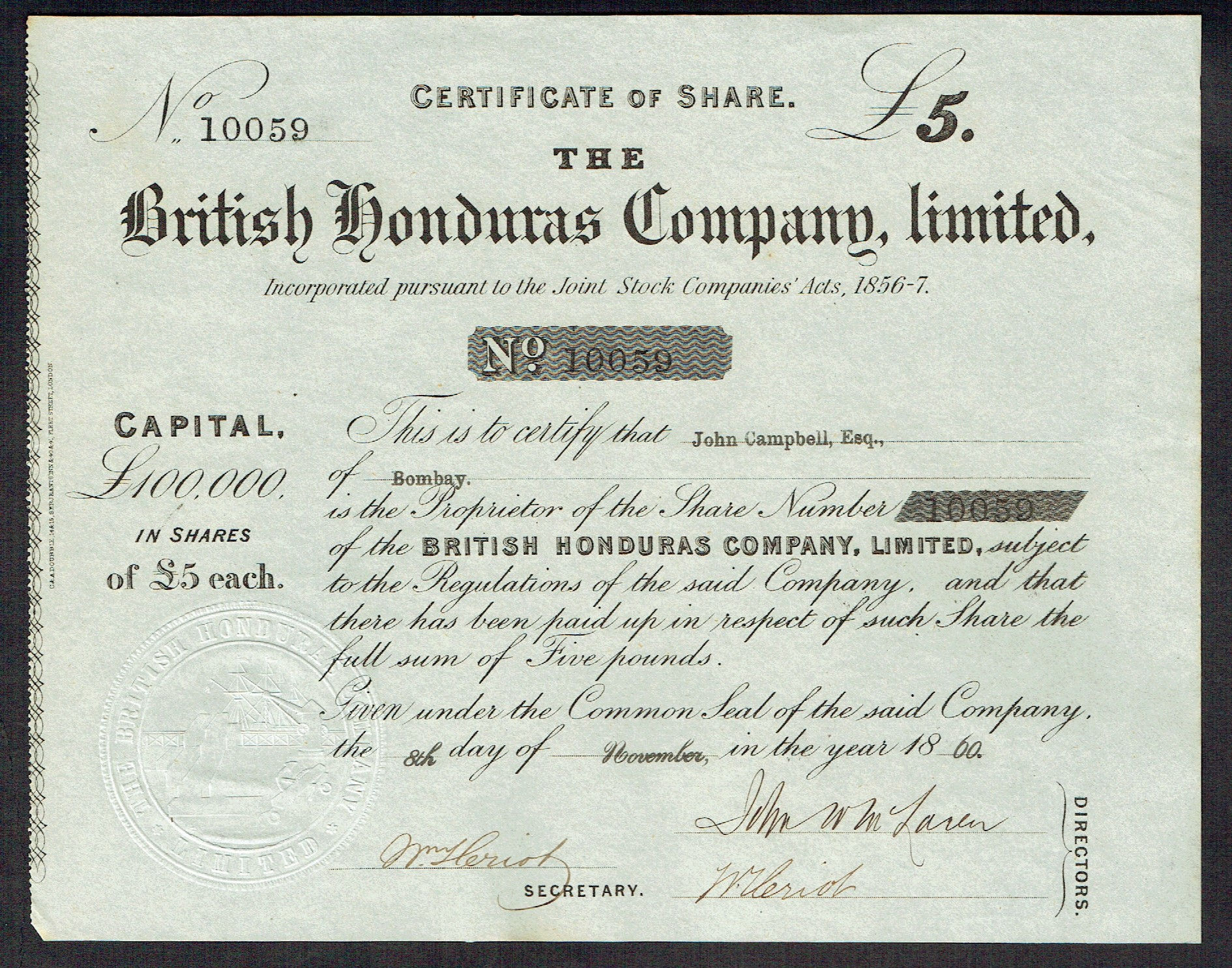 마호가니 수출은 1846년 정점을 찍은 후 급감하여 1850년대 이후 경제는 장기 불황에 빠졌다. 이 불황은 구 정착민 계급의 쇠퇴와 영국 자본 및 토지 소유의 강화를 가져왔다. 특히 '영국령 온두라스 회사'는 다른 토지 소유주들의 희생을 발판 삼아 확장하며 주요 토지 소유주로 부상했다. 이 회사는 1859년 유한 회사로 등록되었으며, 이후 식민지 경제에 막대한 영향력을 행사하게 된다.[4]