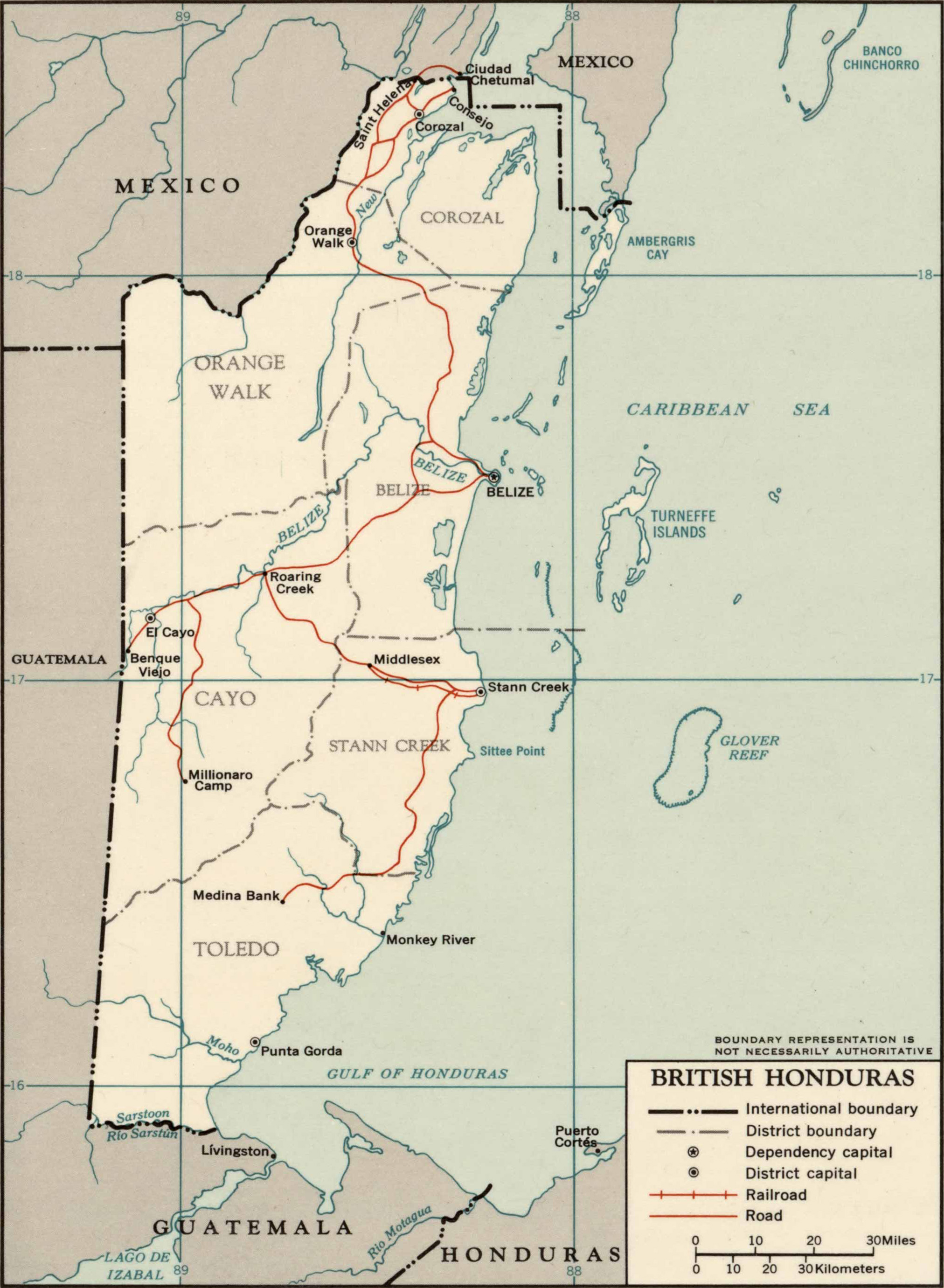 과테말라와의 영토 분쟁은 18세기로 거슬러 올라간다. 당시 조약들은 스페인의 주권을 인정하면서도, 영국 정착민들이 인구가 희박하고 경계가 불분명한 지역에 계속 거주하는 것을 허용했다. 1786년 런던 협약은 스페인의 주권을 다시 확인했지만, 스페인은 1798년 이후 이 지역을 되찾으려는 시도를 하지 않았다. 과테말라 주장의 핵심 근거는 1859년에 영국과 맺은 조약이었다. 영국은 이 조약이 이미 영국의 지배하에 있던 지역의 경계를 명확히 한 것이라고 보았지만, 과테말라는 자신들이 카리브해 연안까지 이어지는 도로 건설을 영국이 지원하는 조건으로 영유권 주장을 포기한 것이라고 해석했다. 영국이 약속된 도로를 건설하지 않자, 과테말라는 1884년에 조약을 파기하겠다고 선언했지만 실제 행동으로 옮기지는 않았다.[4]