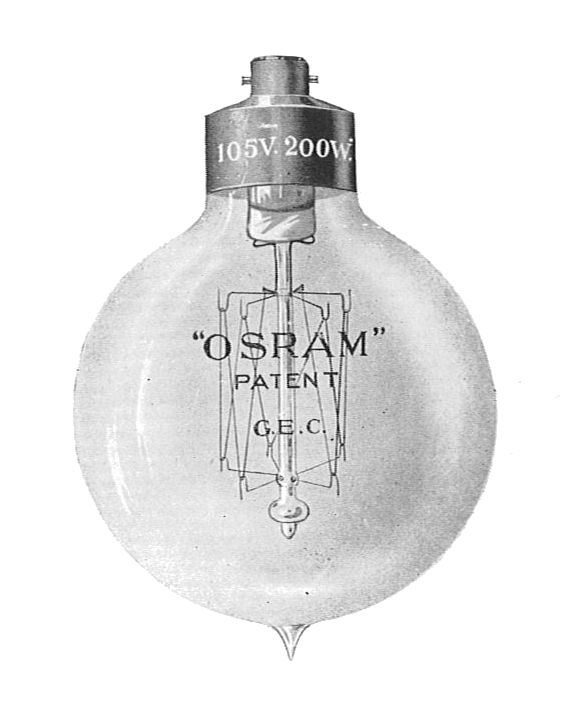 1906년, 칼 아우어 폰 벨스바흐에 의해 오스람 백열전구(백열등)가 개발되었다. 오스람이라는 브랜드 이름은 같은 해에 도이체 가스글뤼흘리히트-안슈탈트(Auer-Gesellschaft로도 알려짐)에 의해 등록되었다.[13] 영국의 제너럴 일렉트릭 컴퍼니(General Electric Company plc)는 자체 전구 생산을 위해 오스람 필라멘트를 수입했다.
