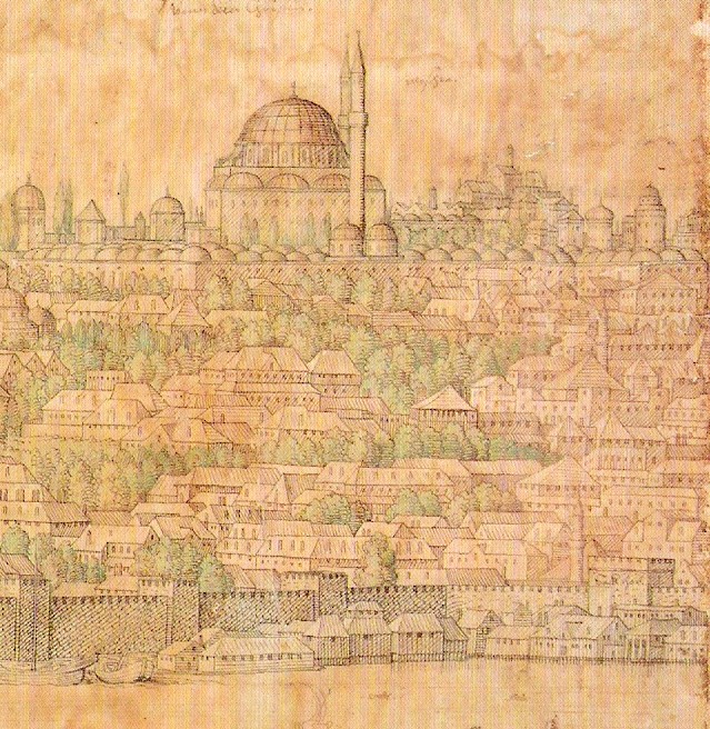 16세기 삽화로 이스탄불에 있는 원래의 파티흐 모스크(위쪽), 1463년에서 1470년 사이에 건설되었다. (원래 건물의 대부분은 1766년 이스탄불 지진으로 파괴되었다.)