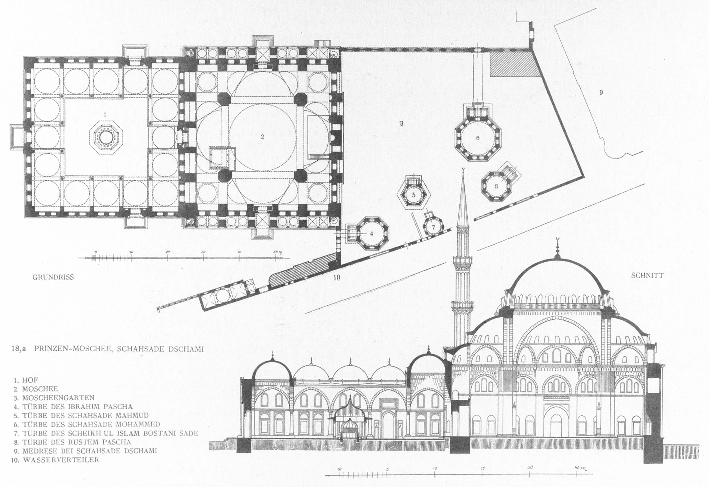 미마르 시난이 설계한 셰흐자데 모스크(1545~1548)는 중앙 돔과 사방의 반원형 돔, 그리고 모서리의 작은 돔들로 구성된 대칭적인 구조를 가지고 있다.