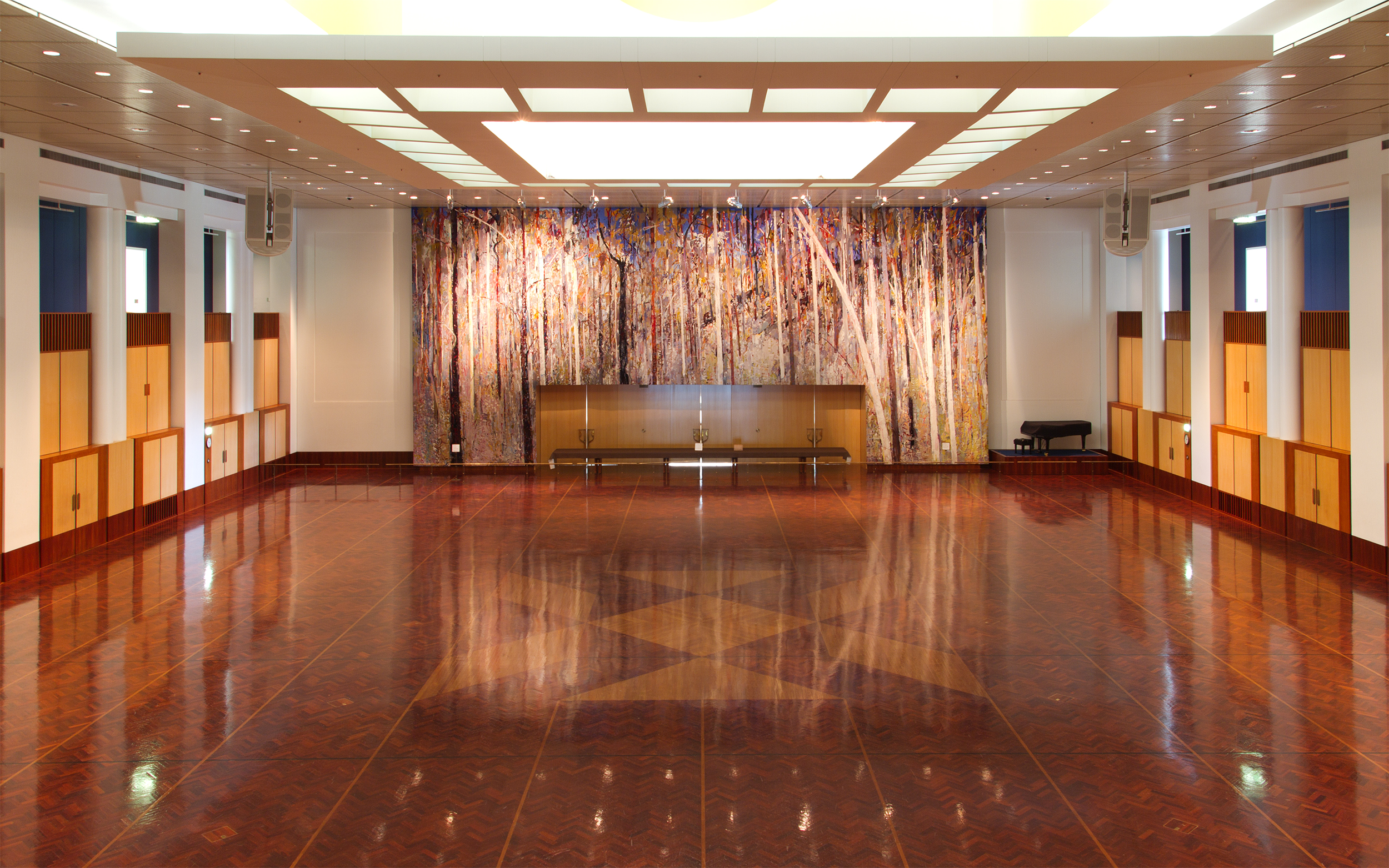 국회의사당은 4,700개의 방을 갖추고 있으며, 많은 구역이 일반에 공개되어 있다. 주 현관에는 대리석 계단이 있으며, 아서 보이(Arthur Boyd)의 그림 ''Untitled (Shoalhaven Landscape)''를 바탕으로 한 대형 태피스트리가 전시된 대강당으로 이어진다.[17] 하원 의사당은 녹색으로 장식되어 있으며, 상원 의사당은 붉은색 배색을 사용한다. 두 의사당 사이 건물 중앙에는 회원 회관이 있으며, 유리 지붕 바로 아래에 분수와 대형 중앙 국기가 있다. 일반인은 회관에 출입할 수 없지만 발코니에서 위를 내려다볼 수 있다. 행정 구역에는 내각 회의실, 오스트레일리아 총리실(Prime Minister's Office) 및 기타 장관실이 있다.4. 2. 앞마당 (Forecourt)