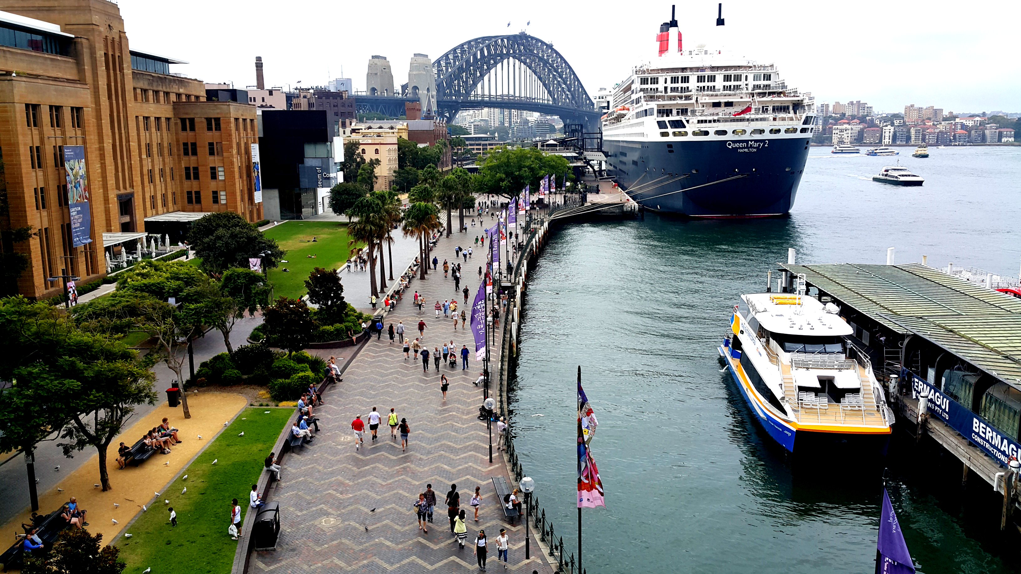 넓은 잔디밭이 박물관과 동쪽의 부두 사이를 가르고 있다. 서쪽과 북서쪽에는 더 록스가 도시화되어 밀집되어 있으며, 19세기와 20세기 초의 2층 또는 3층 복합 용도 건물이 다리 남쪽으로 접근하는 부분까지 이어져 있다. 근처에는 유람선이 부두에 정박하고 있으며, 시드니 지역을 운행하는 페리가 선착장에서 도착하고 출발한다.[3]