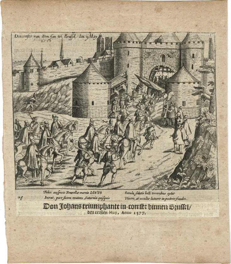1577년 5월 1일, 오스트리아의 욘이 브뤼셀에 환희 입성하는 모습. W. 보다르티우스가 저술한 '나사우 전쟁'의 판화, 암스테르담, 1616년