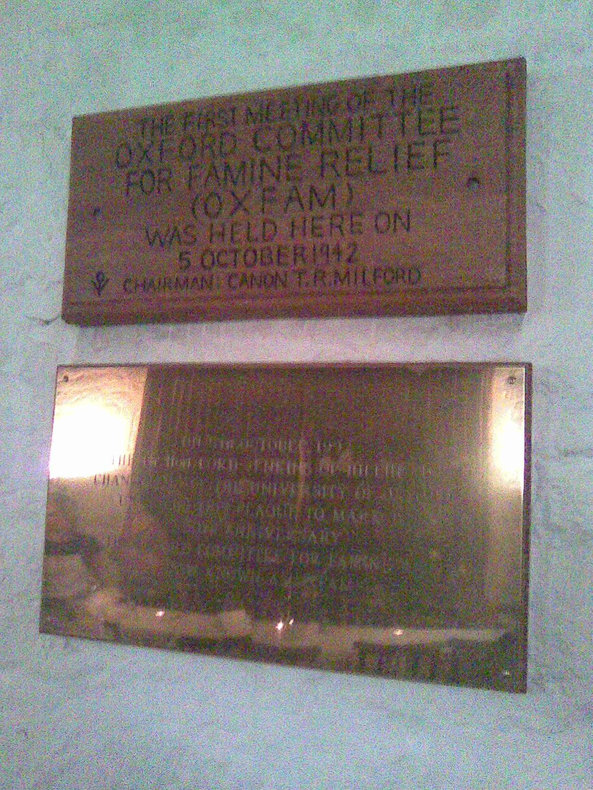 옥스팜은 1942년 옥스퍼드 브로드 스트리트 17번가에서 퀘이커 교도, 사회 운동가, 옥스퍼드 학자 그룹에 의해 '옥스퍼드 기아 구호 위원회'(Oxford Committee for Famine Relief)로 설립되었으며, 1943년 영국 법에 따라 등록되었다.[4] 최초의 위원회는 헨리 길렛(Henry Gillett, 저명한 지역 퀘이커 교도), 테오도어 리처드 밀포드, 길버트 머레이와 그의 아내 메리, 세실 잭슨-콜, 앨런 핌을 포함한 시민 그룹으로 구성되었다. 위원회는 1942년 옥스퍼드 성모 마리아 대학교 교회의 구 도서관에서 처음 회의를 열었으며, 그리스 대기근으로 고통받는 그리스 점령 시민들을 돕고, 추축국의 그리스 점령과 연합군의 해상 봉쇄로 인한 기아를 해결하며, 영국 정부가 봉쇄를 통해 식량 구호를 허용하도록 설득하는 것이 목표였다. 옥스퍼드 위원회는 전국 기아 구호 위원회를 지원하기 위해 결성된 여러 지역 위원회 중 하나였다.[4]