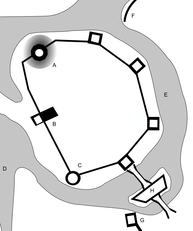 12세기 후반에서 13세기 초에 이르러, 원래 나무로 만들어졌던 성벽과 성채는 돌로 대체되었다.[14] 새로운 석조 성벽에는 여러 주요 건축물이 포함되었다.