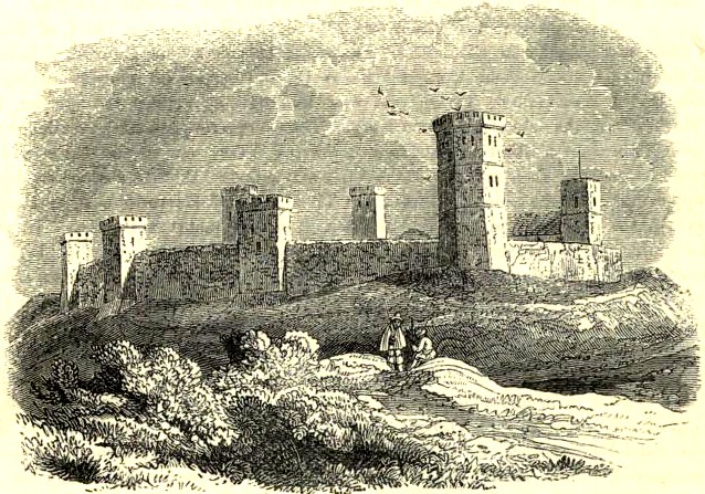 12세기 후반에서 13세기 초까지, 원래의 울타리 벽과 나무 성채는 돌로 대체되었다.[14] 새로운 성벽에는 세인트 조지 타워가 포함되어 있는데, 이 타워는 산호석으로 지어졌으며, 바닥은 약 9.14m x 약 9.14m이고 안정성을 위해 위쪽으로 갈수록 현저하게 가늘어진다.[15] 이 타워는 성에서 가장 높은 타워였으며, 현재 색슨 시대 후기(c. 1020)에 색슨 도시의 서쪽 문과 관련된 감시탑으로 남아 있는 것으로 여겨진다.[16][17][18] 이 타워가 색슨 시대에 기원하여 성보다 앞선다는 증거는 푸어(Poore) 외(2009)에 제시되어 있으며,[19] 이들은 "단일의 거대한 돌 타워는 흙과 나무로 된 성의 외부 방어 시설에 속하지 않는 것 같다"라고 언급하고 있으며, 다른 출처에서도 건축적인 근거에서 동의하며, 그 방향이 나머지 성의 방향과 일치하지 않고, 원래 높이가 도시 전체를 광범위하게 조망할 수 있었지만 성 토루의 건설로 대체(실제로 차단)되었을 것이라고 언급하고 있다.[20][21][22] 나머지 타워의 연대는 불확실하지만, 가장 남쪽에 있는 둥근 타워는 기저부가 아직 남아 있으며, 1825년 울노스의 ''잉글랜드와 웨일스의 고대 성''을 포함한 다양한 문서 자료에서 1235년으로 기록되어 있다. 적어도 하나의 자료에서는 "헨리 3세의 타워"라고 언급되어 있다.[23]