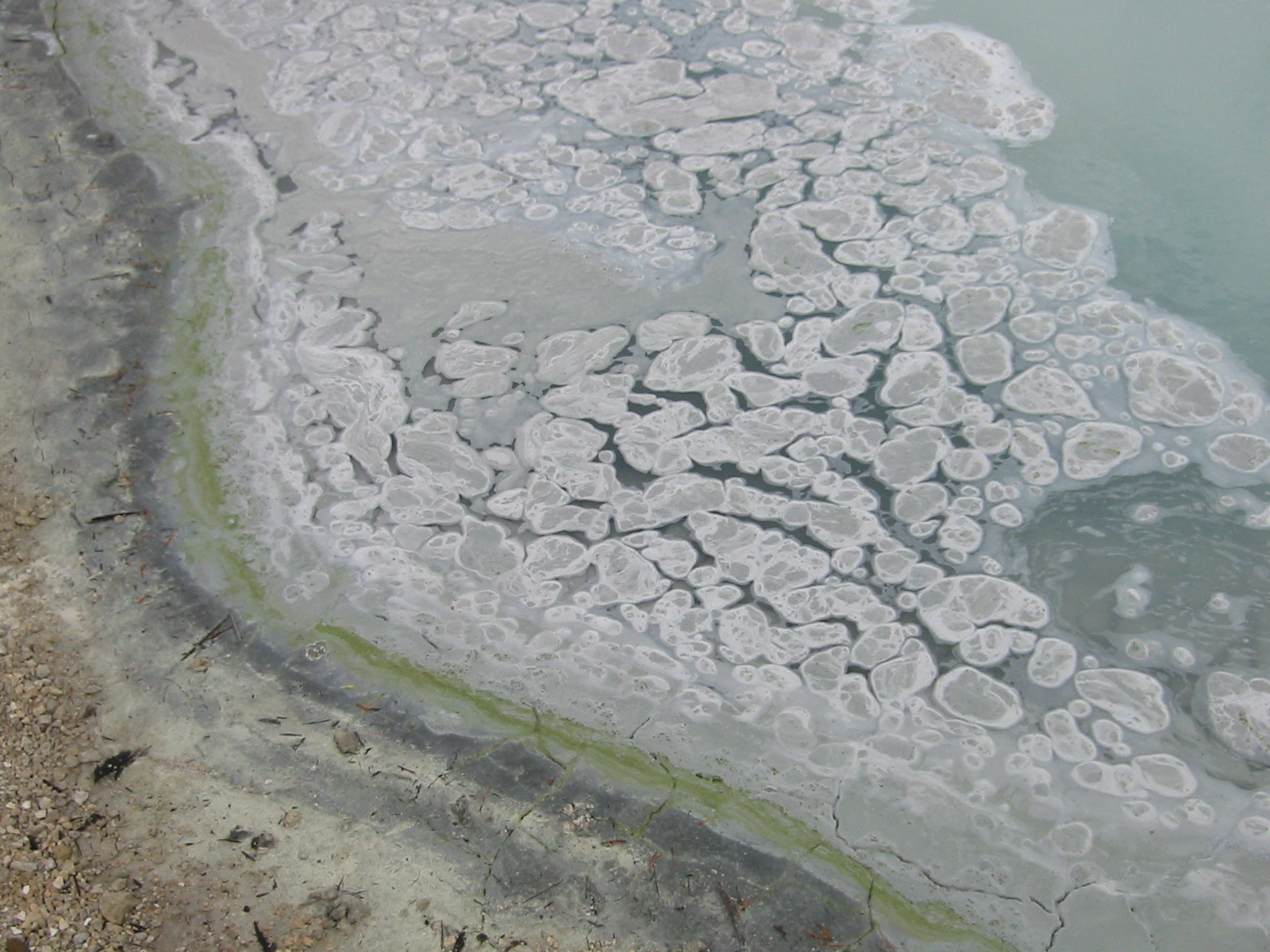 온천에는 뜨겁고 광물이 많은 물에서 서식하도록 적응된 미생물 군집이 서식한다. 여기에는 45°C에서 80°C 사이의 고온에서 번성하는 호열성 생물이 포함된다.[33] 배출구에서 멀어질수록 물이 식고 광물질 일부가 침전되어 덜 극한 조건에 적응된 유기체에게 유리해진다. 이는 배출구에서 멀어짐에 따라 미생물 군집의 연속적인 변화를 만들어내는데, 이는 초기 생명의 진화 단계를 연상시키기도 한다.