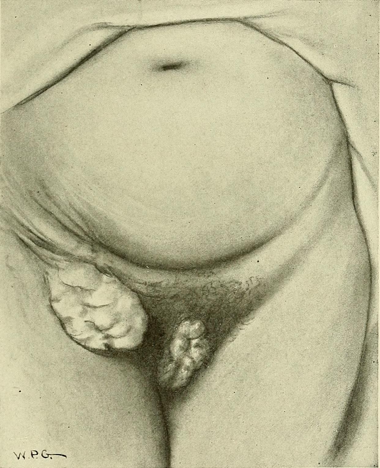 일반적으로 병변은 대음순에 덩어리나 궤양 형태로 나타나며, 배뇨통이나 성교통 외에도 가려움, 자극, 국소 출혈 또는 분비물이 동반될 수 있다.[8] 소음순, 음핵, 회음 및 치구 등 다른 부위에 나타나는 경우는 상대적으로 드물다.[9] 수줍음이나 당혹감 때문에 증상이 있어도 병원 방문을 미루는 경우가 있을 수 있다.[10]
