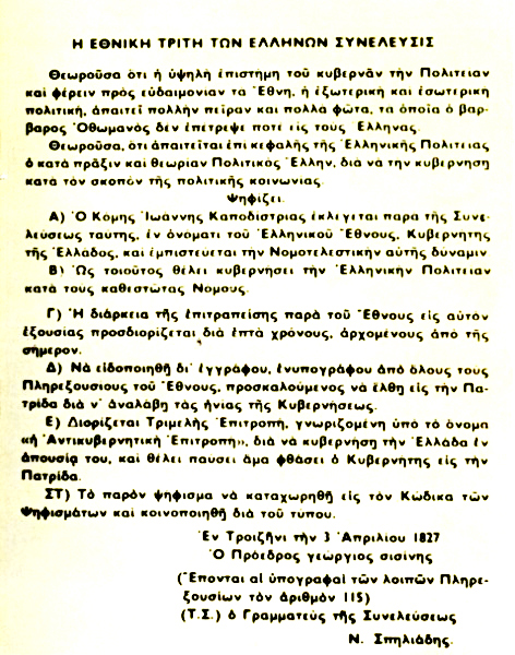 트로이젠에서 열린 제3차 국민의회에서의 카포디스트리아스 선출