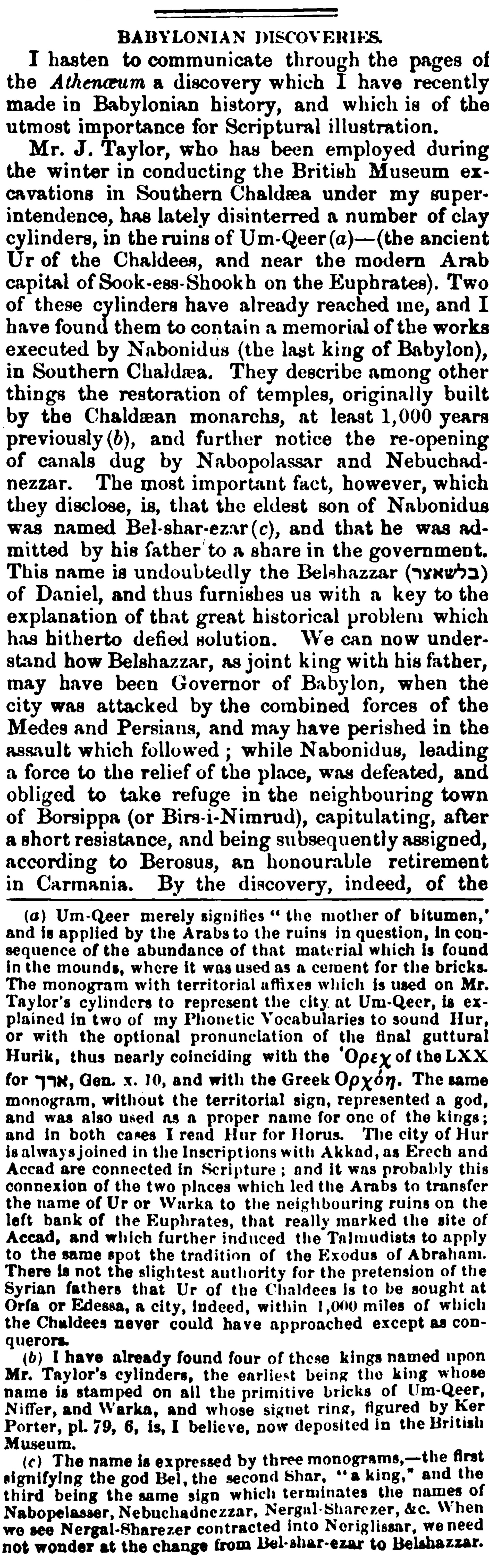 유럽 고고학자들이 현재의 '텔 엘-무케이야르' 유적을 고대 도시 우르로 특정한 것은 19세기 중반이다. 헨리 롤린슨은 1849년 윌리엄 로프터스가 가져온 벽돌 명문을 해독하여 이곳이 우르임을 밝혀냈다.