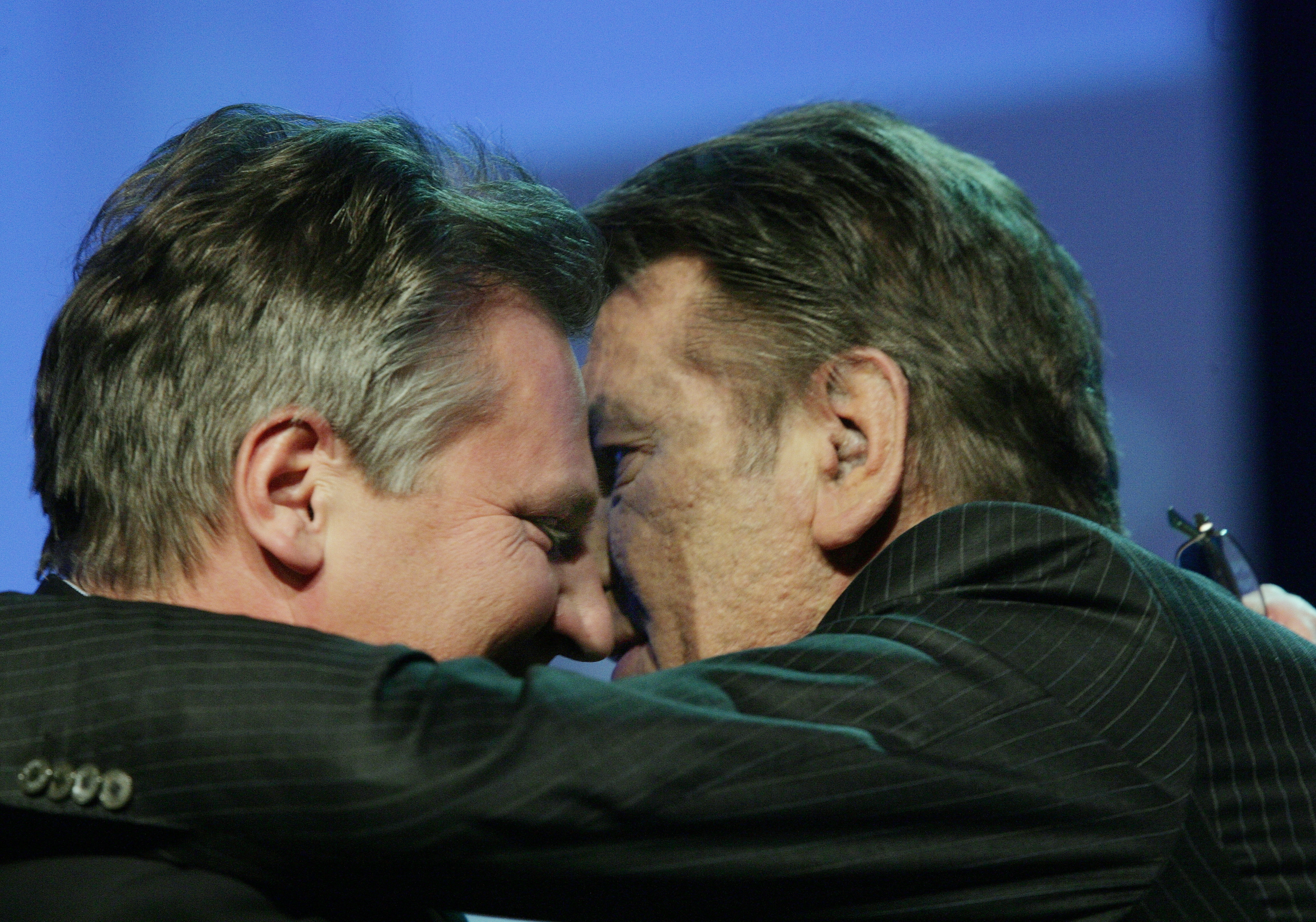 빅토르 유셴코 우크라이나 대통령(오른쪽)에게 키스하는 알렉산데르 크바시니에프스키 폴란드 대통령. 2005년, 다보스.