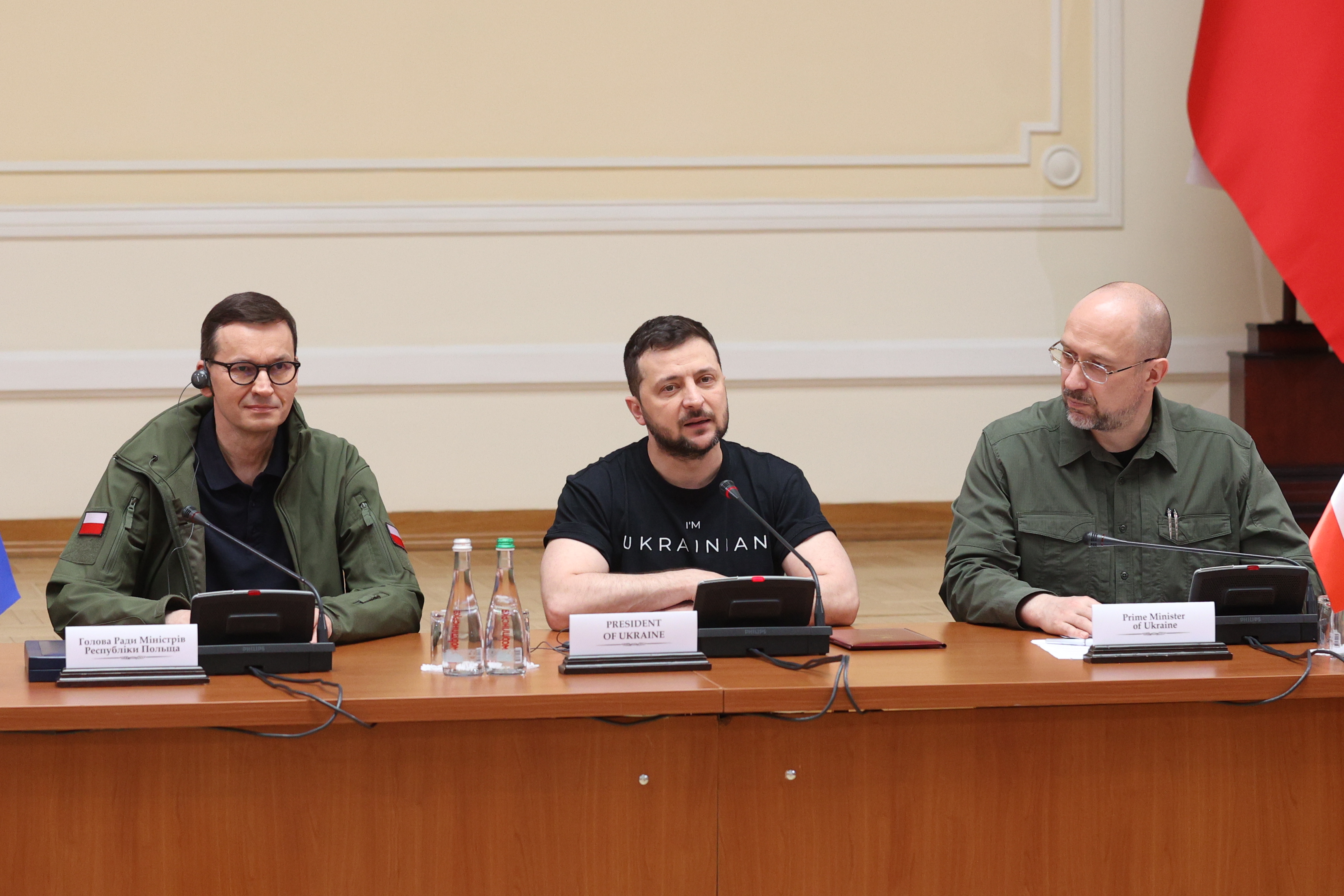 폴란드 총리 모라비에츠키, 우크라이나 대통령 볼로디미르 젤렌스키와 우크라이나 총리 데니스 슈미할이 2022년 키예프에서 열린 정부 간 협의에서 대화하고 있다.