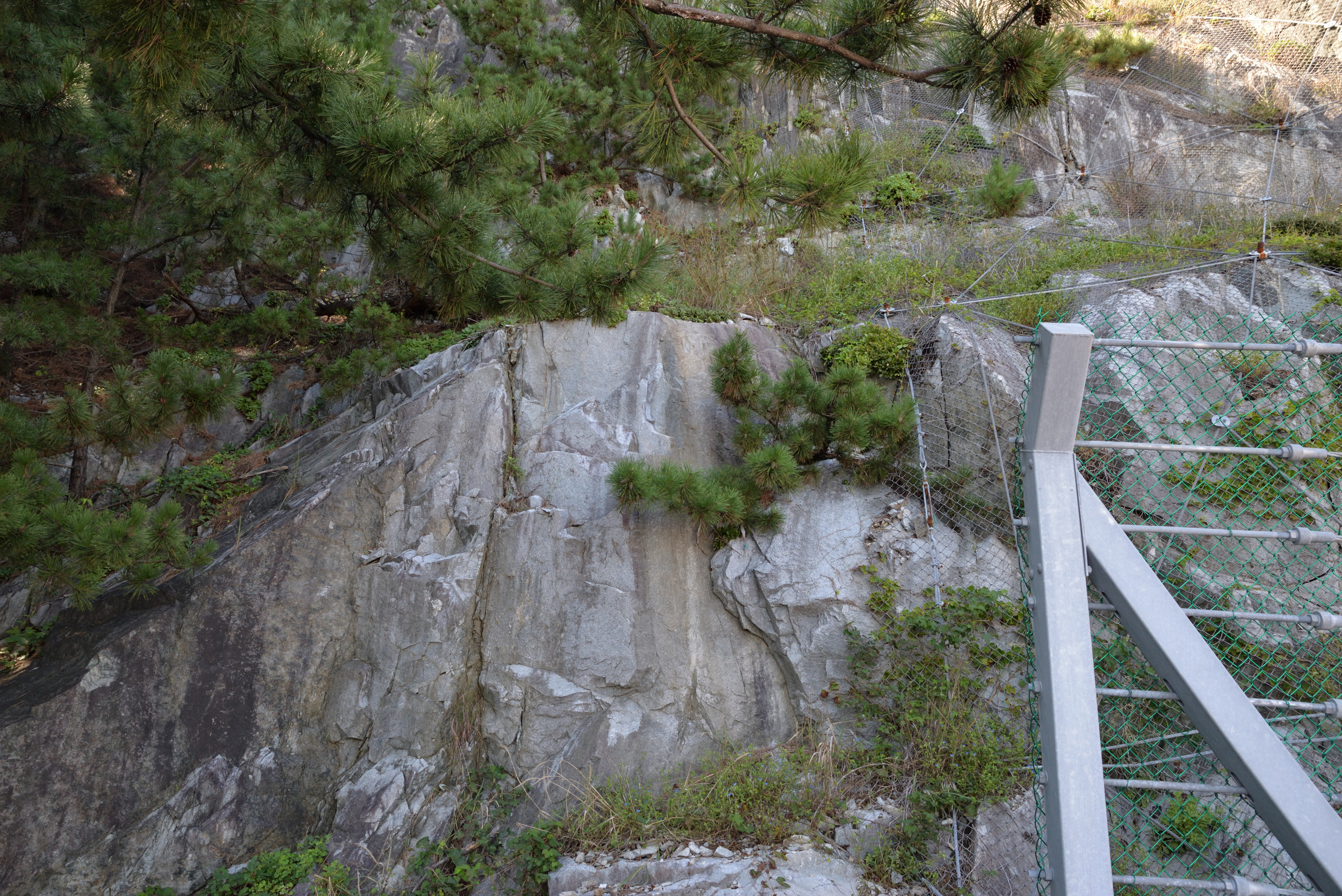 - 북면 하당리 나그네재 도로변 사면(N37°02'24.21", E129°19'37.73")에는 홍제사 화강암 내에 염기성 암맥이 2매가 관찰되며 이들을 주향 북동 49°/경사 북서 43°자세의 단층이 절단하는 노두가 있다.[1]