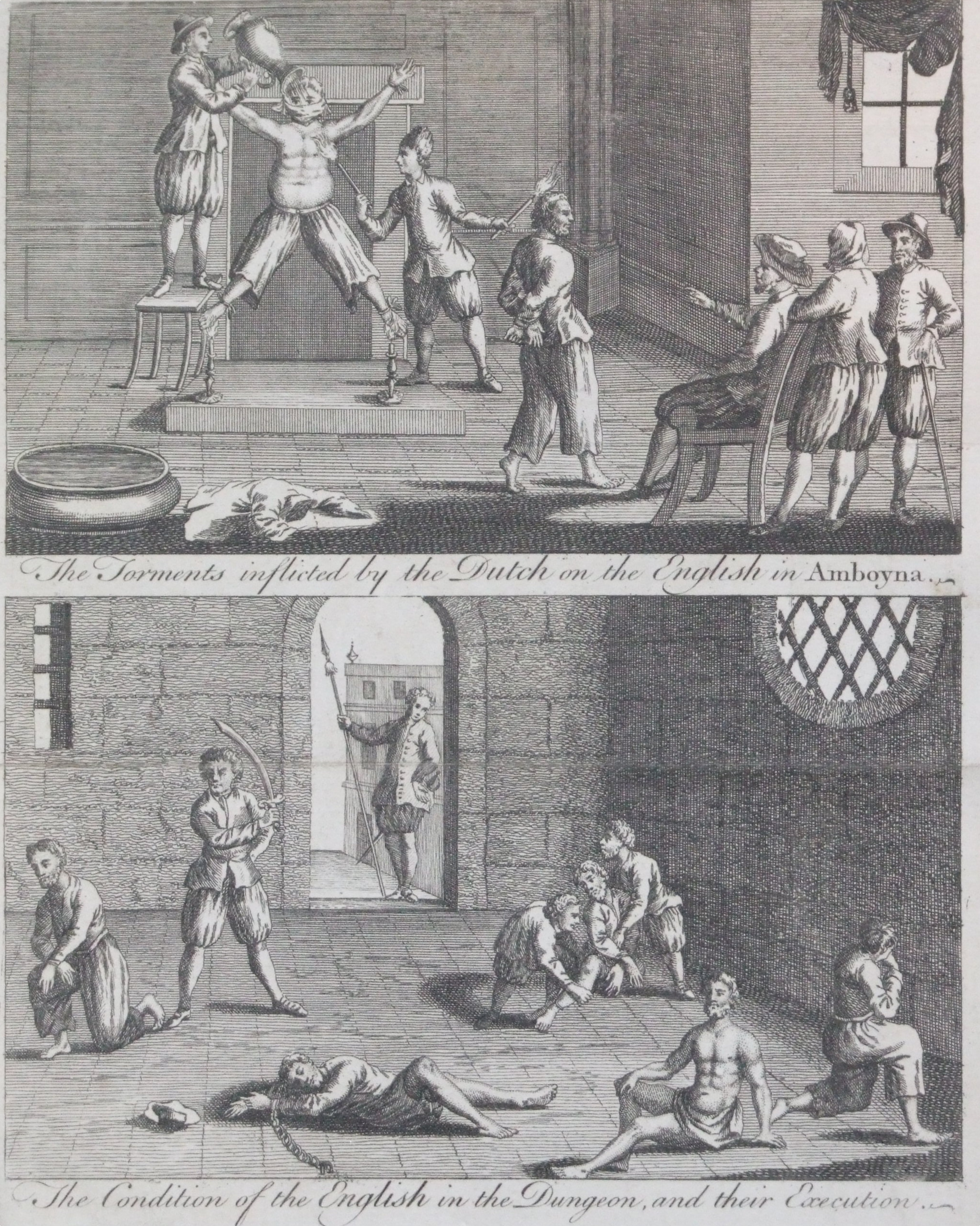 1623년, 몰루카 제도의 암보이나 섬에서 발생한 암보이나 학살 당시, 네덜란드 동인도 회사 요원들은 영국인 포로들에게 물고문의 전신과 같은 고문을 가했다. 당시 고문 방식은 피해자의 머리에 천을 감싼 뒤, 고문관들이 "입과 콧구멍, 그리고 그보다 조금 더 높은 곳까지 천이 흠뻑 젖도록 천천히 물을 부어, 숨을 쉴 수 없도록 물을 빨아들이게 하는 것"이었다.[81][82][83][84] 한 경우에는 고문관이 피해자의 "몸이 이전보다 두세 배나 부풀어 오르고, 뺨은 큰 주머니처럼 되고, 눈은 이마 밖으로 튀어나올 정도"가 될 때까지 세네 번이나 연속으로 물을 부었다.[83][84][85][86]